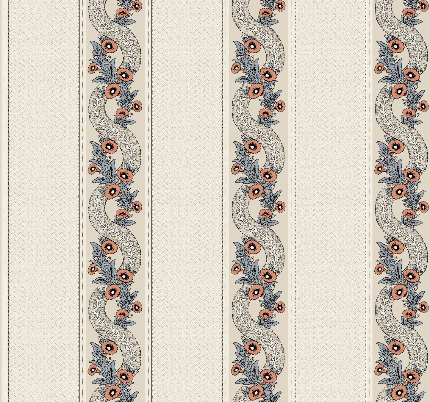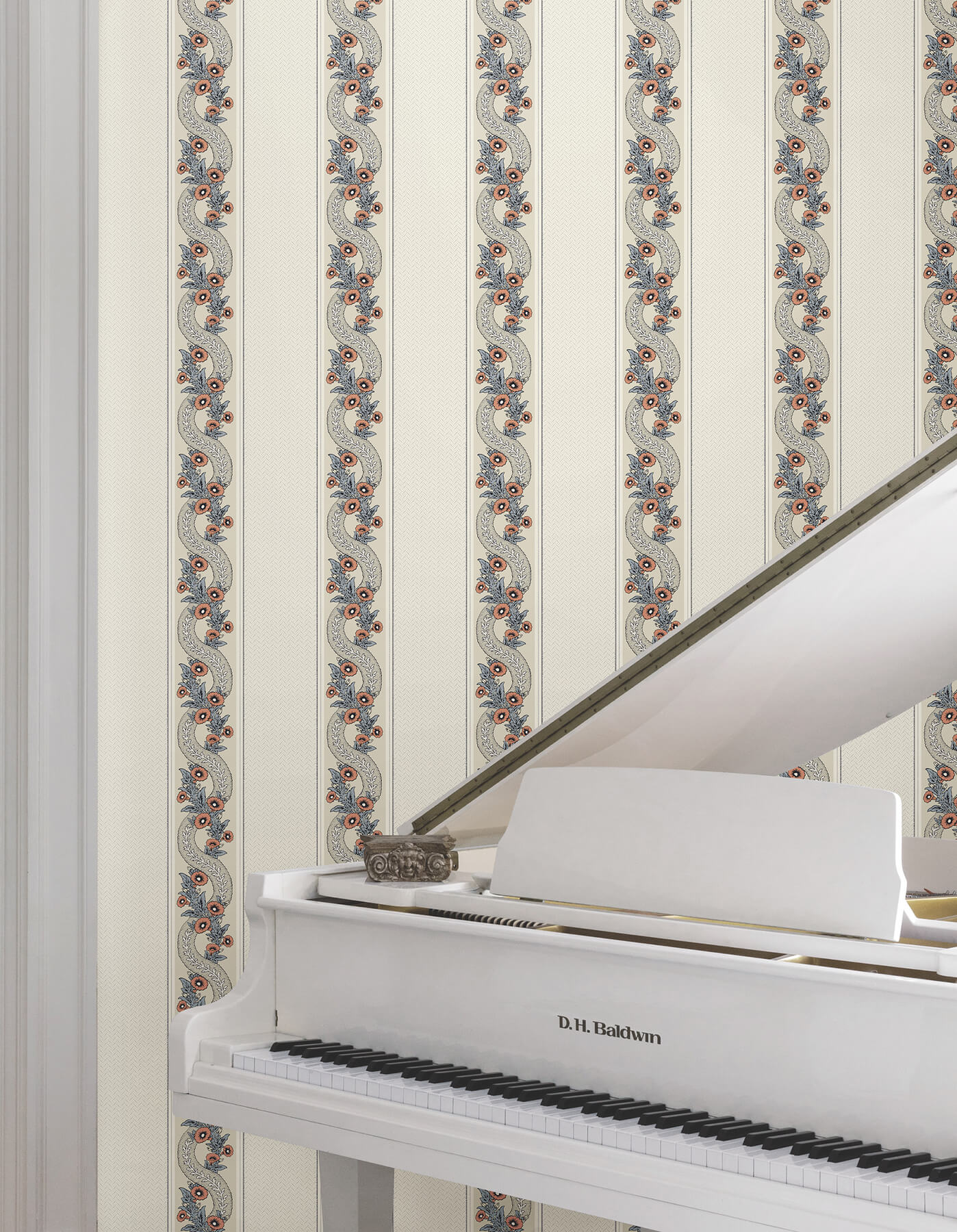 Intertwining columns of vines and campanula flowers alternate with wide bands embellished with dotted zigzags in pattern Abbey's Garland. Featured here with coral blooms, blue vines, and beige stippling against a cream ground. This Abbey's Garland Wallpaper measures approximately 27 inches wide by 27 feet long, measuring approximately 60.8 square feet per roll. Traditional and timeless meets modern refinement, with artfully crafted designs redefined in striking color palettes.
