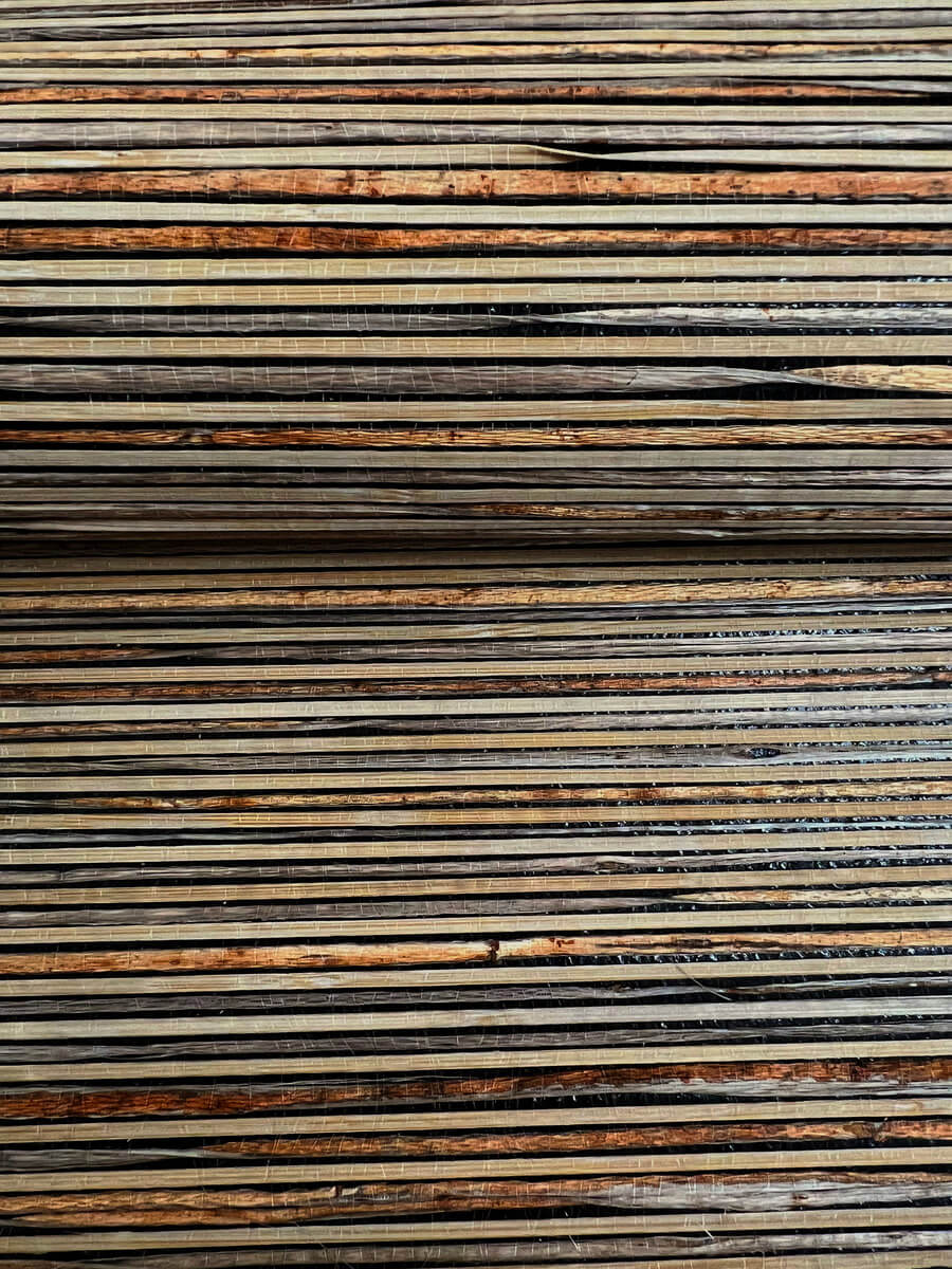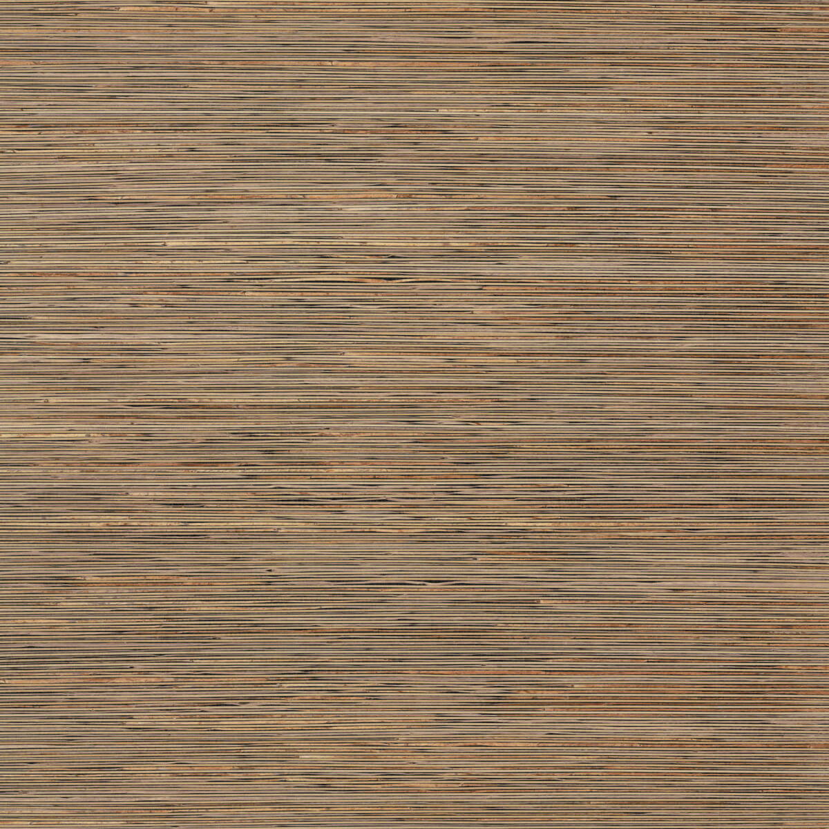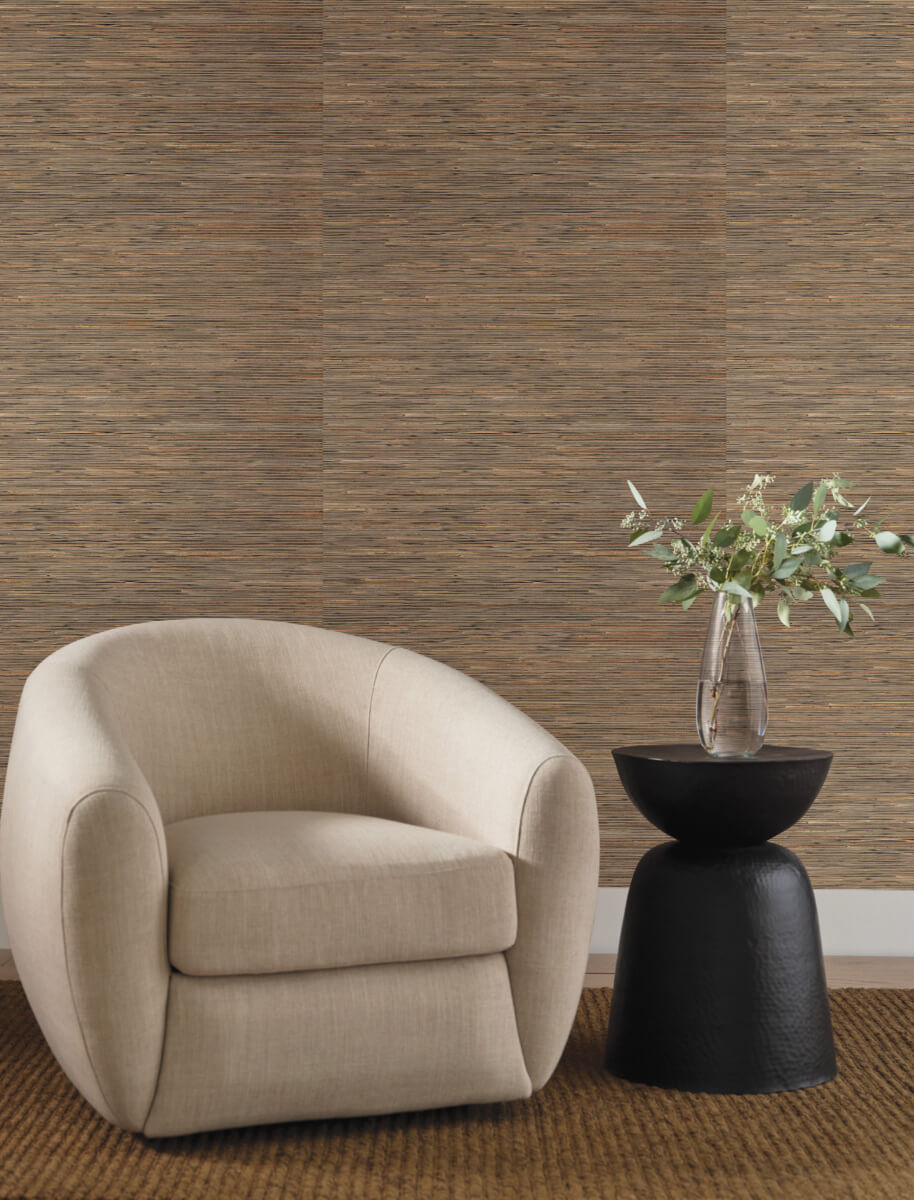 Authentic, wash-coated horizontal strips of bamboo and hemp are applied over a base of metallic foil and high gloss to create touches of shimmer in pattern Bamboo Hemp Blend, shown in natural brown and beige on a gloss black ground. This Bamboo Hemp Blend Wallpaper measures approximately 36 inches wide by 24 feet long, measuring approximately 72 square feet per roll. Finding beauty in this extraordinary organic world.