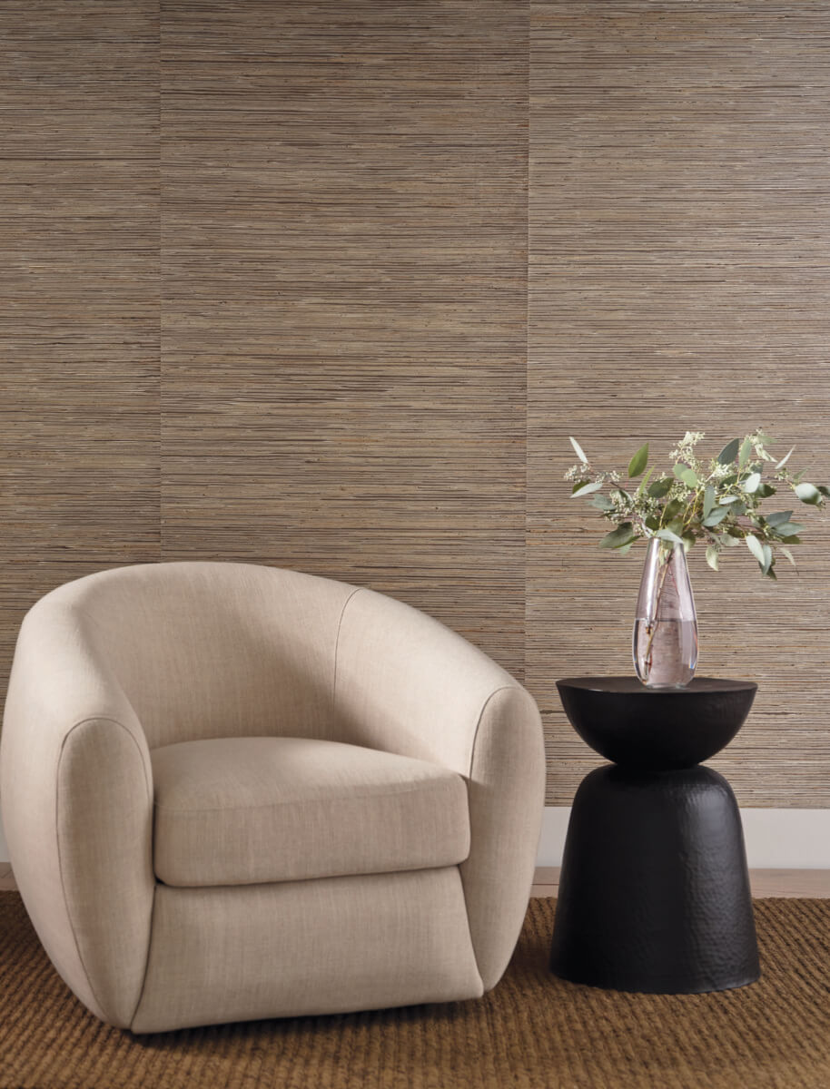 Authentic, wash-coated horizontal strips of bamboo and hemp are applied over a base of metallic foil and high gloss to create touches of shimmer in pattern Bamboo Hemp Blend, shown in taupe grey on a silver foil ground. This Bamboo Hemp Blend Wallpaper measures approximately 36 inches wide by 24 feet long, measuring approximately 72 square feet per roll. Finding beauty in this extraordinary organic world.