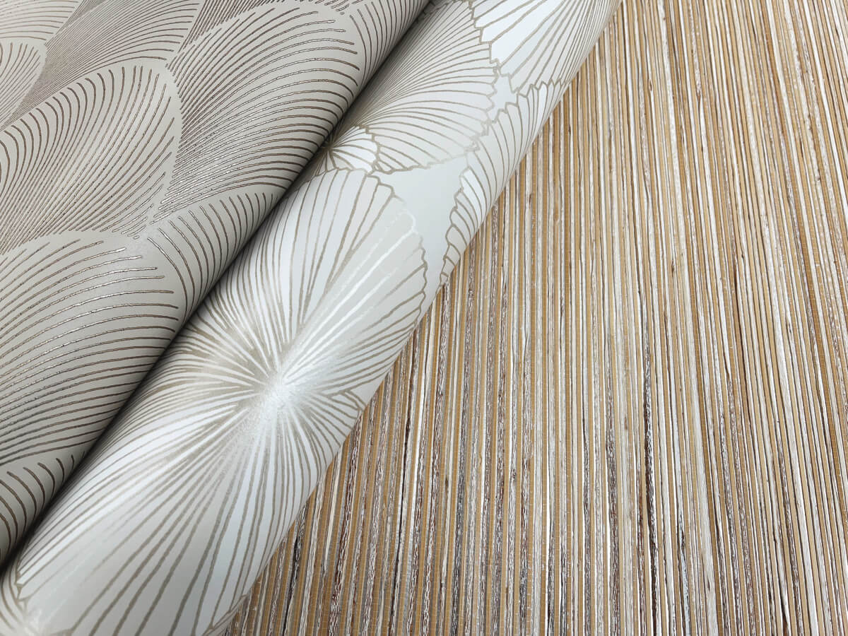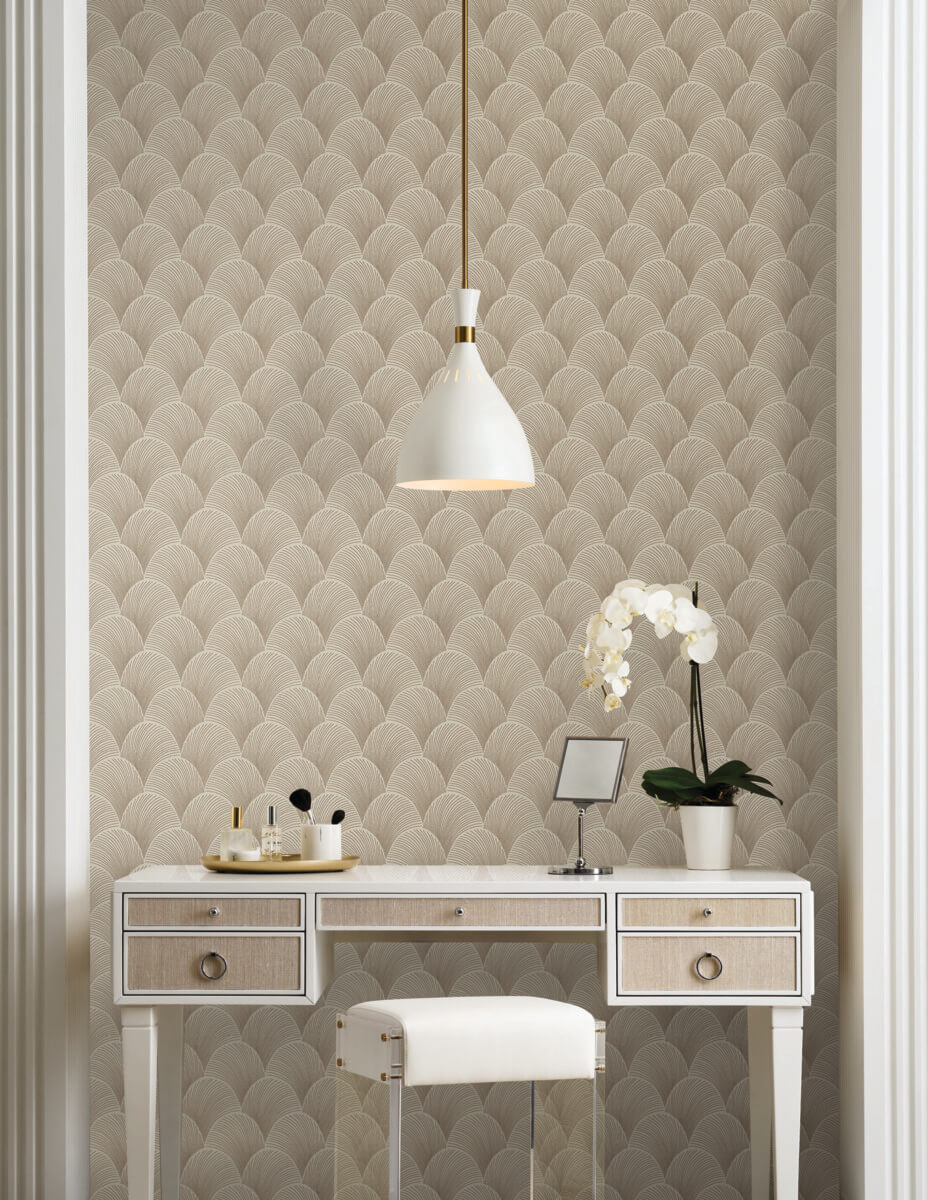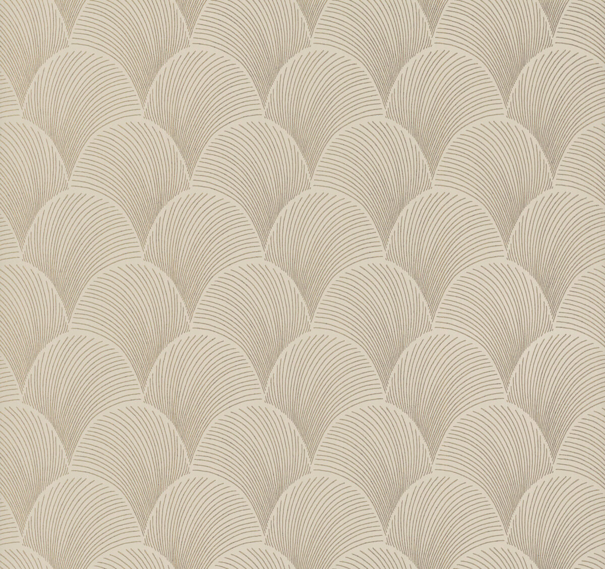 The half-moon overlapping fans of the pattern Metallic Scallop create a field of color, accented with thin lines of raised liquid shimmer to emphasize its beautiful organic curves, shown in beige with antique gold. This Metallic Scallop Wallpaper measures approximately 27 inches wide by 27 feet long, measuring approximately 60.8 square feet per roll. Finding beauty in this extraordinary organic world.