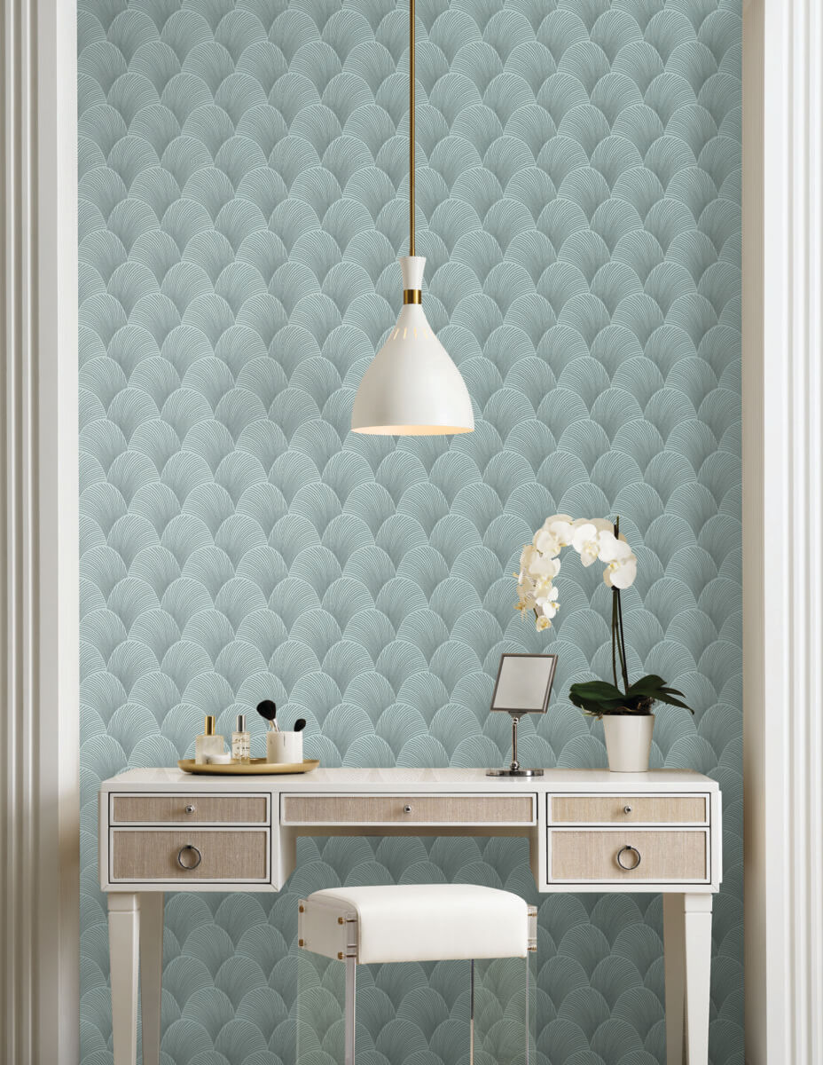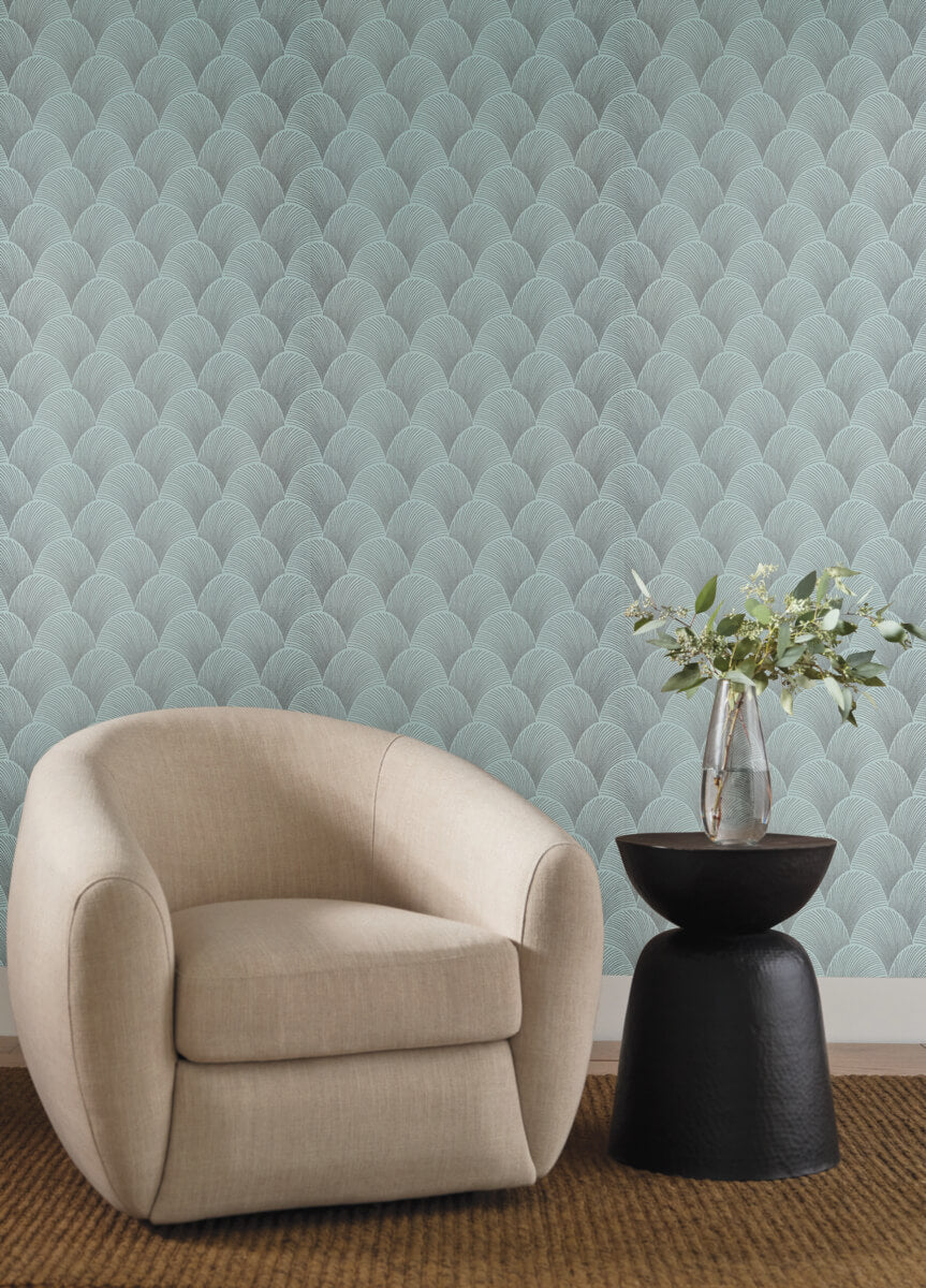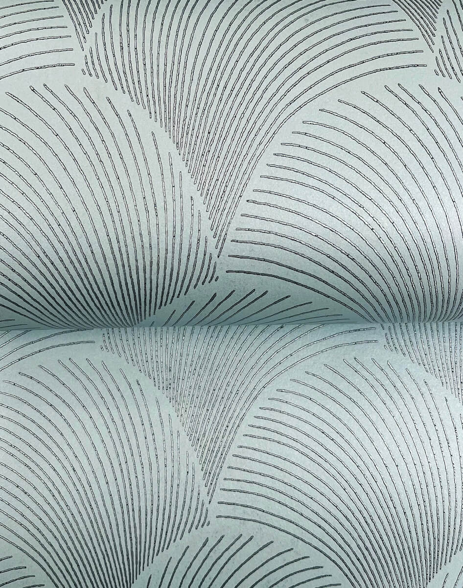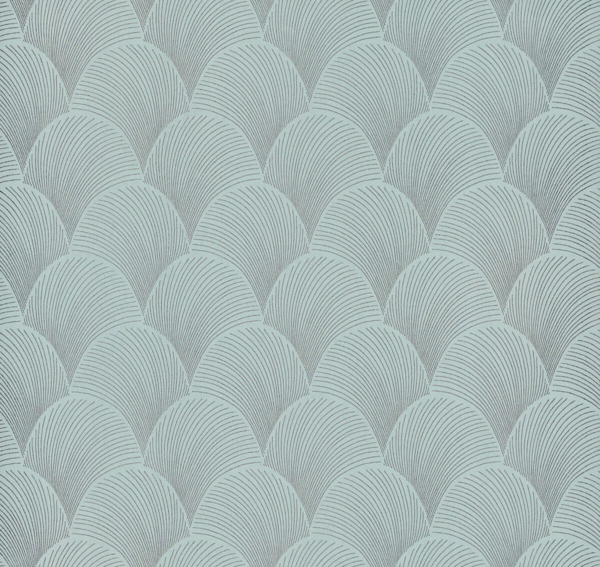 The half-moon overlapping fans of the pattern Metallic Scallop create a field of color, accented with thin lines of raised liquid shimmer to emphasize its beautiful organic curvesshown in pearl blue with silver metallic. This Metallic Scallop Wallpaper measures approximately 27 inches wide by 27 feet long, measuring approximately 60.8 square feet per roll. Finding beauty in this extraordinary organic world.