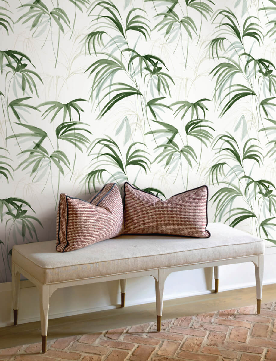 Feathery fronds and weighted stems curtsey and bow in Inky Palm's calligraphy-inspired sketch of natural tropical leaves swaying in the breeze, shown in verdant and palm green on white. This Inky Palms Wallpaper measures approximately 27 inches wide by 27 feet long, measuring approximately 60.8 square feet per roll. Finding beauty in this extraordinary organic world.