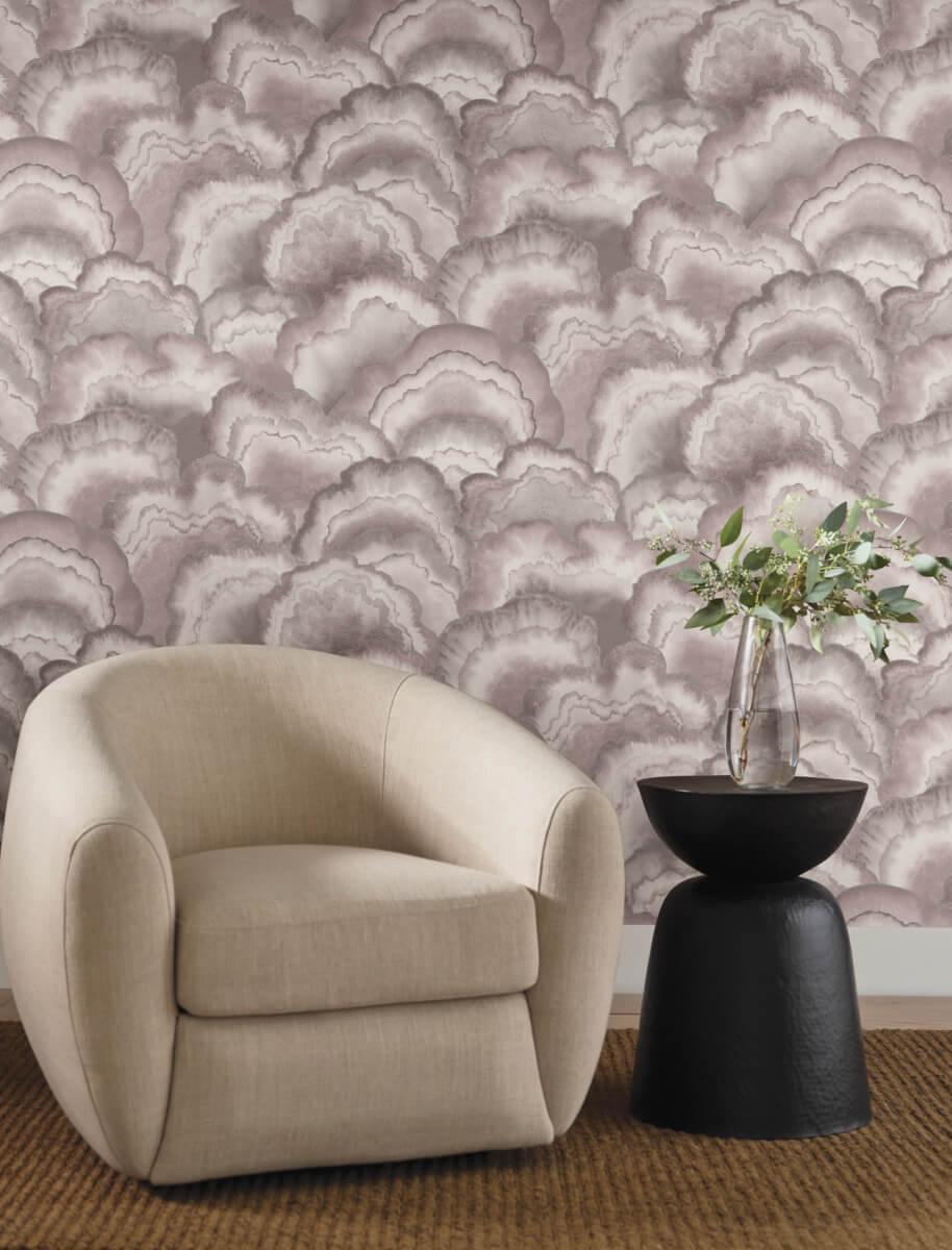 Watercolor demilune shapes create layers of soft, natural semicircles on the pattern Abalone Fans, shown in thistle lavender, with nickel metallic. This Abalone Fans Wallpaper measures approximately 27 inches wide by 27 feet long, measuring approximately 60.8 square feet per roll. Finding beauty in this extraordinary organic world.