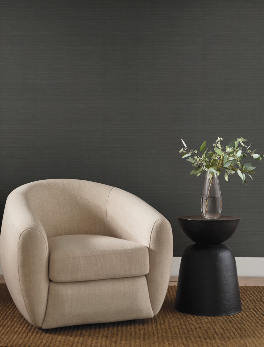 The iconic sheen and silky strands of hand-woven abaca inspire Quite Vista’s high-performance vinyl interpretation of natural grasscloth, shown in ebony black with silver and metallic threads. This Quiet Vista Wallpaper measures approximately 27 inches wide by 27 feet long, measuring approximately 60.8 square feet per roll. Finding beauty in this extraordinary organic world.