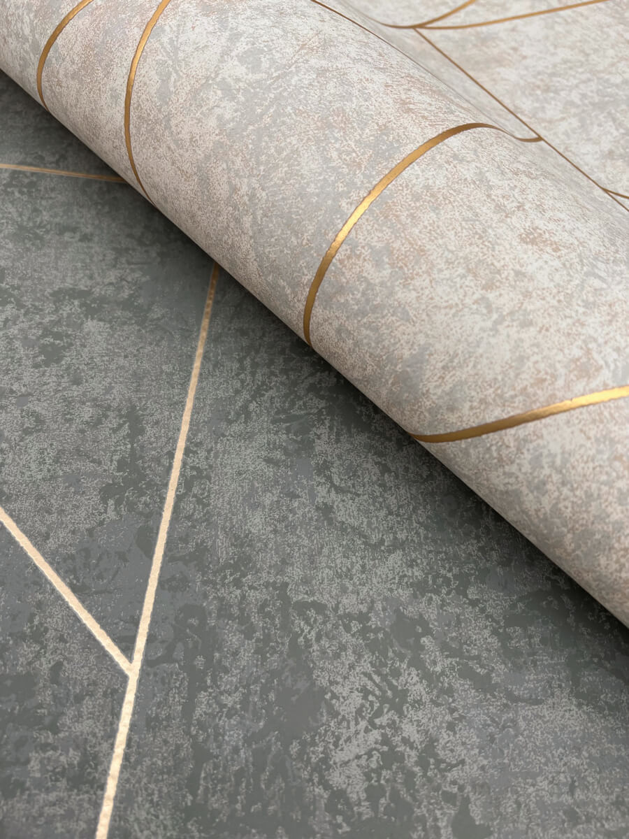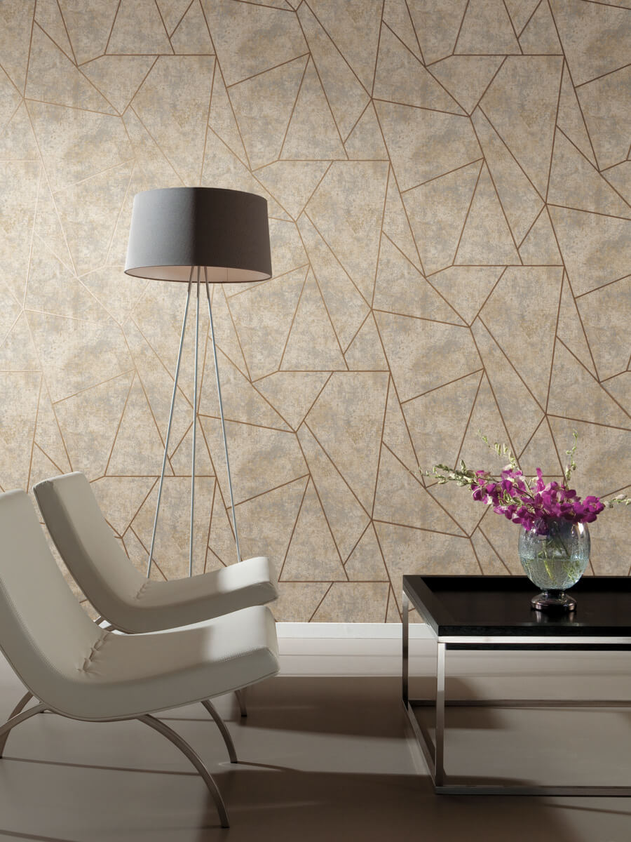 Fractured metallic lines create a contemporary geometric of irregular lines and angles in the Nazca pattern, shown in a neutral beige mix with burnished gold metallic. This Nazca Wallpaper measures approximately 20.8 inches wide by 33 feet long, measuring approximately 57.2 square feet per roll. The long awaited follow-up to the popular first release, Modern Metals Second Edition energizes contemporary spaces with charismatic visual artistry defined by the allure of luminous metallic.