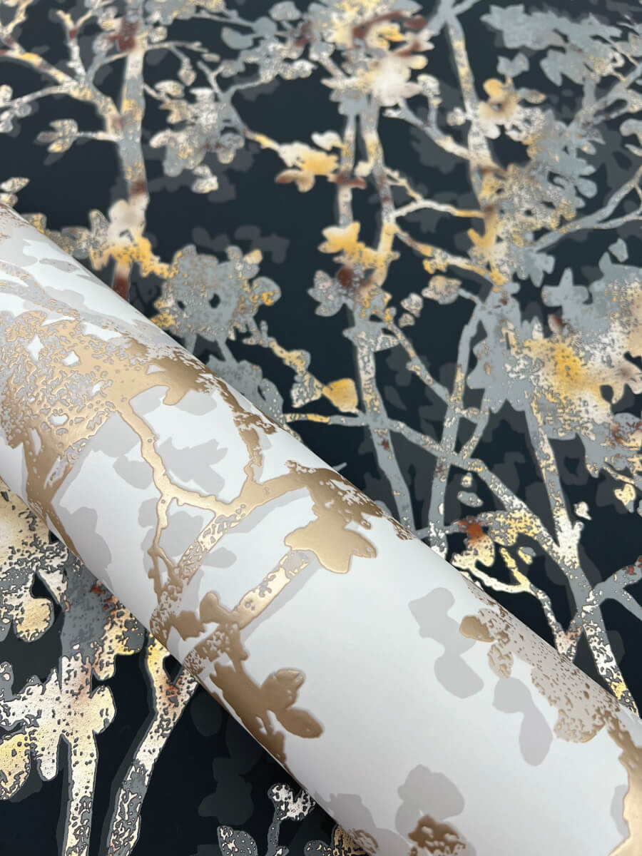 Pattern Shimmering Foliage uses a palette of various combined precious metals to turn commonplace trees into a mesmerizing mysterious grove, shown in alabaster with brass and gold metallic. This Shimmering Foliage Wallpaper measures approximately 20.8 inches wide by 33 feet long, measuring approximately 57.2 square feet per roll. The long awaited follow-up to the popular first release, Modern Metals Second Edition energizes contemporary spaces with charismatic visual artistry defined by the allure of luminous metallic.