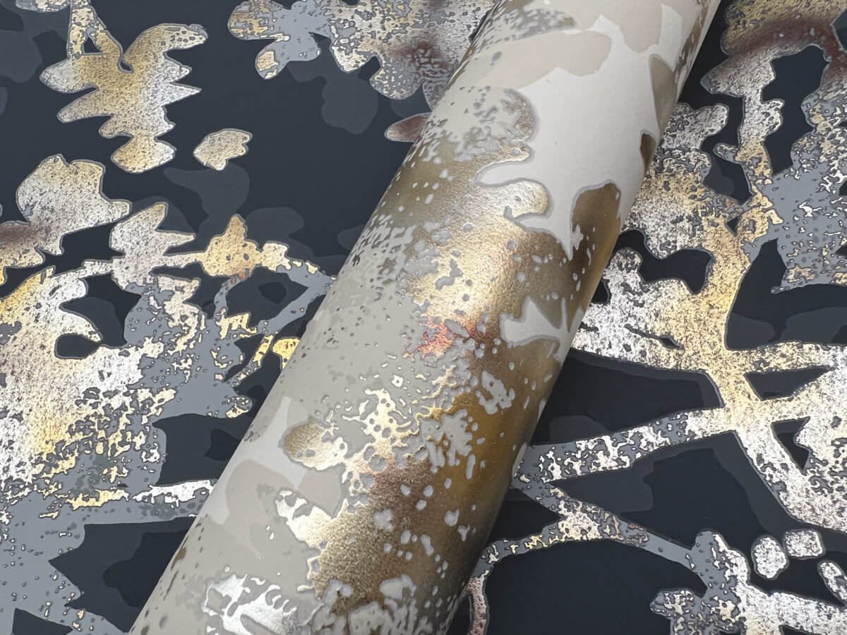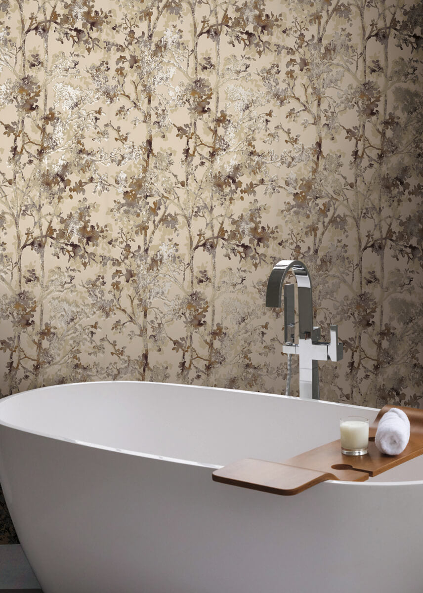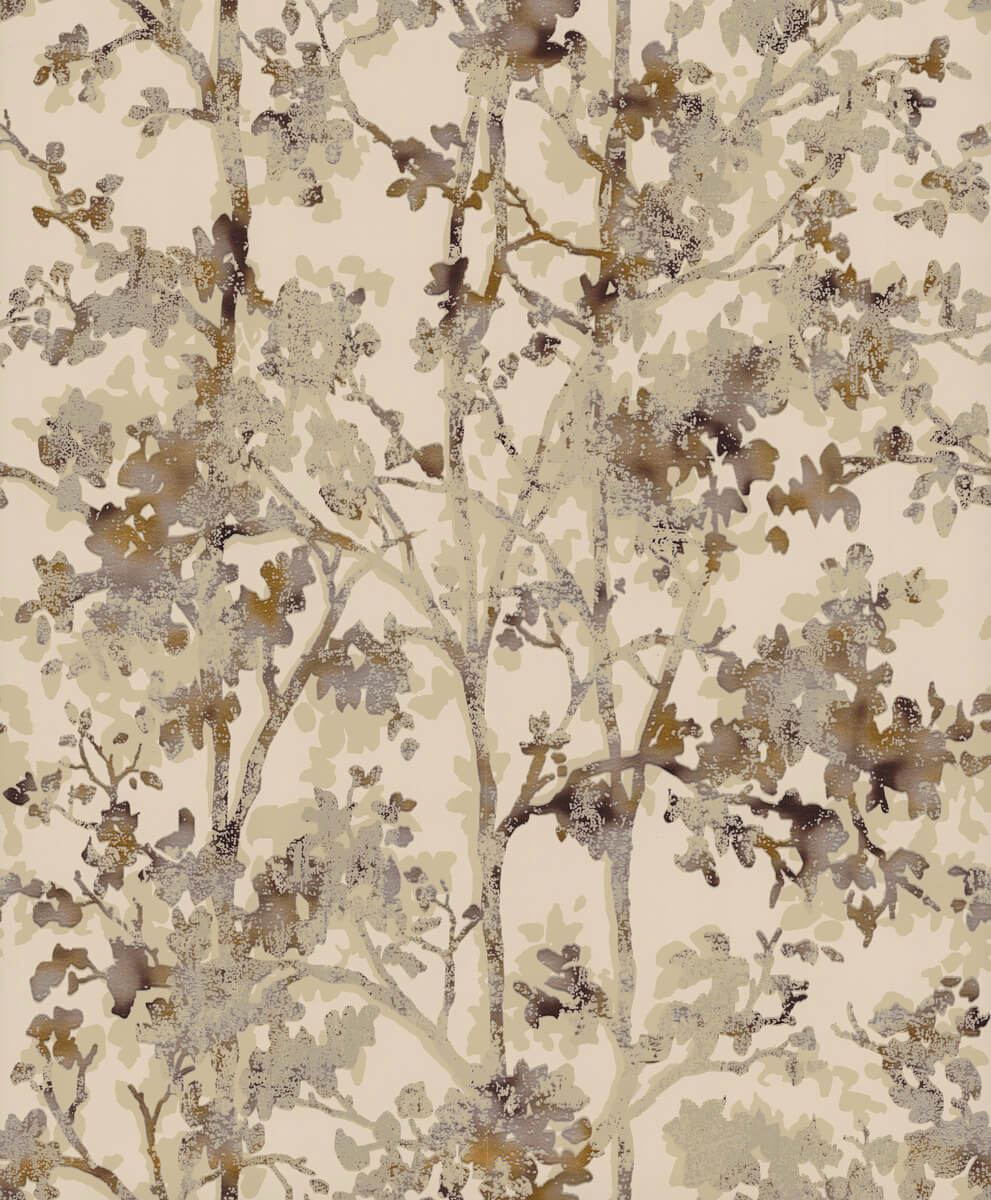 Pattern Shimmering Foliage uses a palette of various combined precious metals to turn commonplace trees into a mesmerizing mysterious grove, shown in copper metallic and gold metallic on khaki tan. This Shimmering Foliage Wallpaper measures approximately 20.8 inches wide by 33 feet long, measuring approximately 57.2 square feet per roll. The long awaited follow-up to the popular first release, Modern Metals Second Edition energizes contemporary spaces with charismatic visual artistry defined by the allure of luminous metallic.