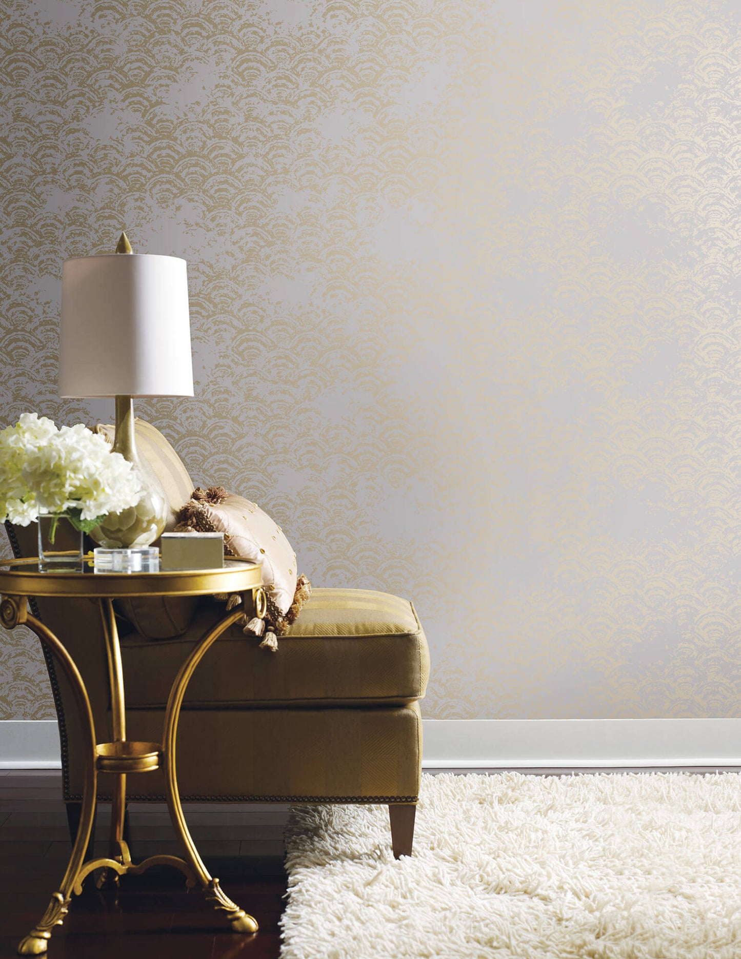 Featuring waves of frothy clouds obscuring the vault of heaven Antonina Vella Eclipse Wallpaper reflects lingering light in a pattern of metallic arcs. Precious metallic colors form geometrics, abstracts, and nature inspired patterns in Antonina Vella's Modern Metals wallpaper collection by York Wallcoverings.