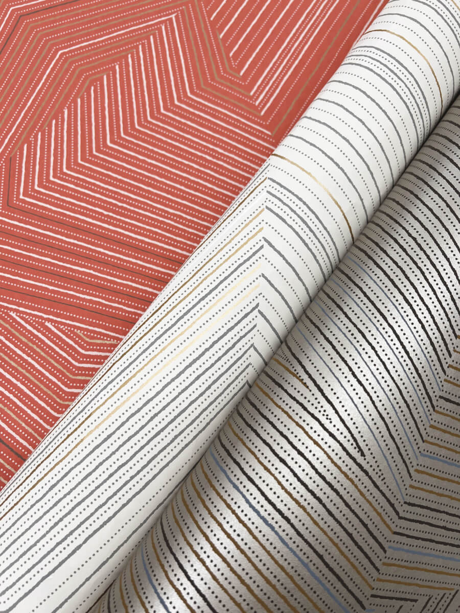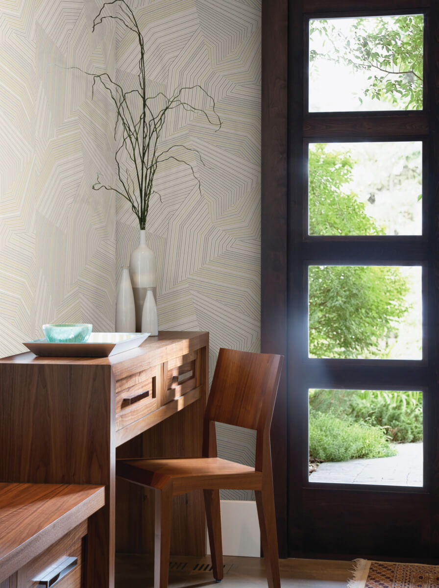 Fractured angles, metallic lines, and stitches become the framework of the new modern abstract Dotted Maze, shown in soft taupe with burnished gold. This Dotted Maze Wallpaper measures approximately 27 inches wide by 27 feet long, measuring approximately 60.8 square feet per roll. The modern aesthetic of natural form.
