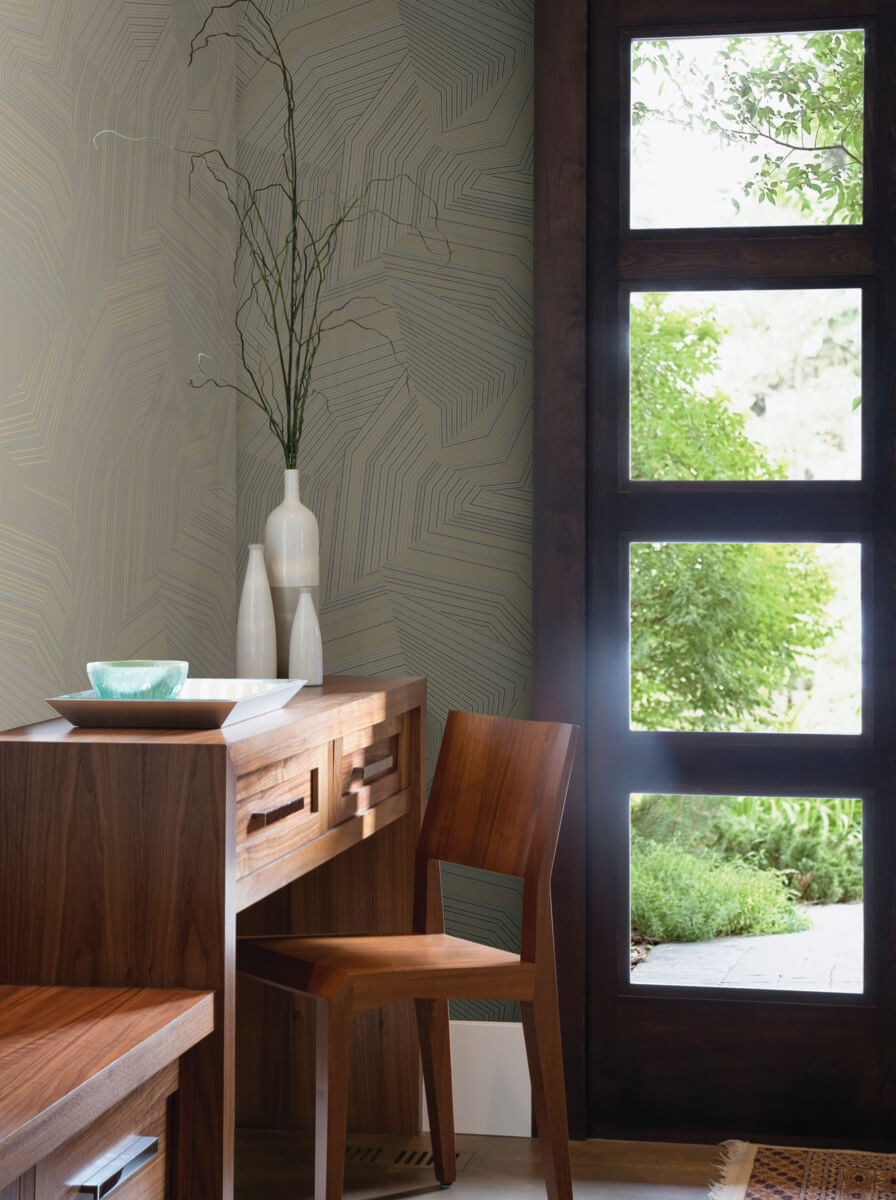 Fractured angles, metallic lines, and stitches become the framework of the new modern abstract Dotted Maze, shown in black and mustard on a glint metallic ground. This Dotted Maze Wallpaper measures approximately 27 inches wide by 27 feet long, measuring approximately 60.8 square feet per roll. The modern aesthetic of natural form.