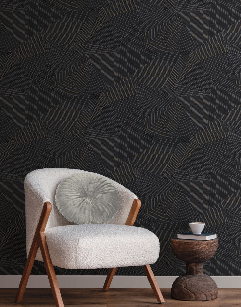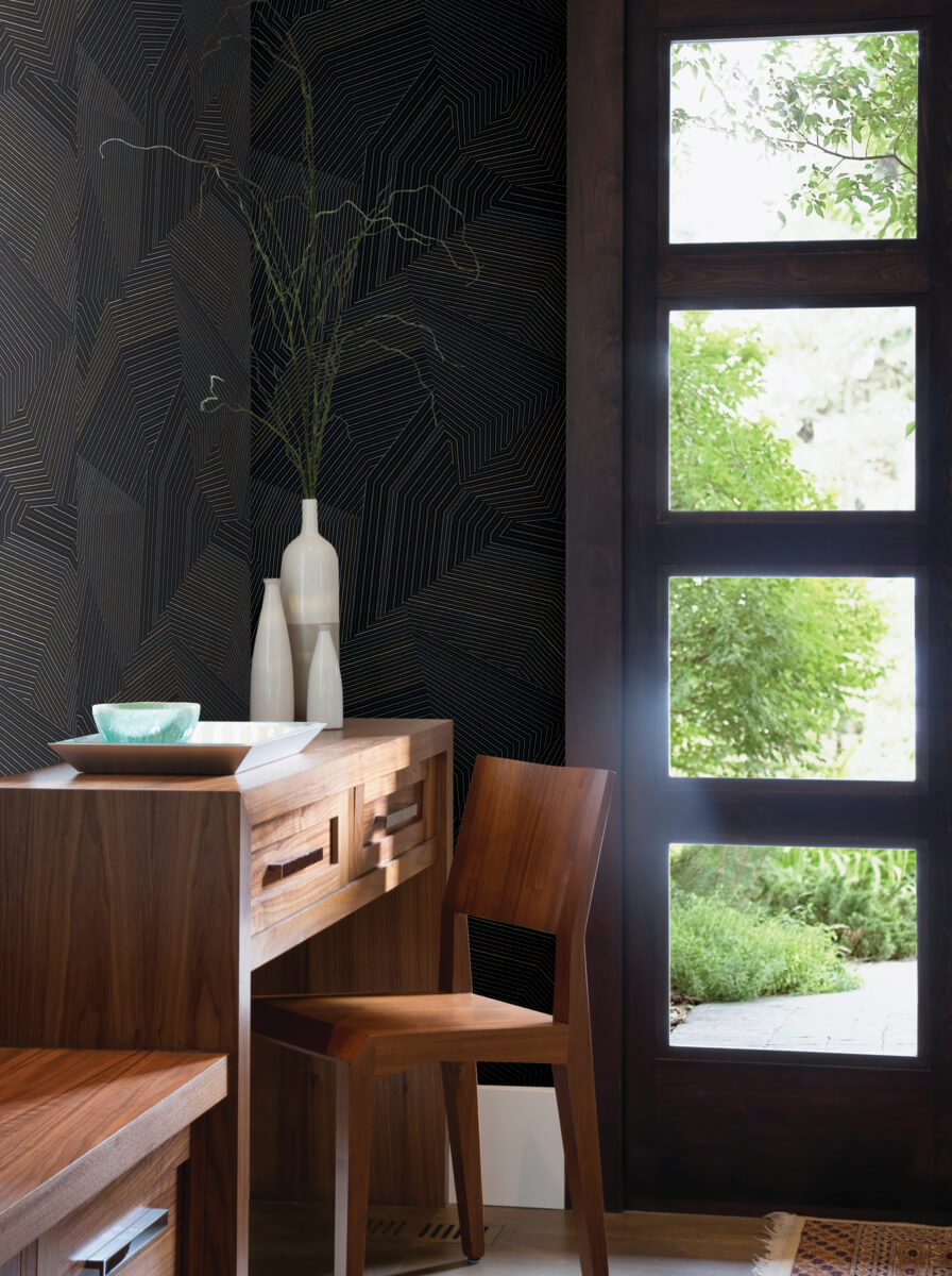 Fractured angles, metallic lines, and stitches become the framework of the new modern abstract Dotted Maze, shown in black onyx with antique gold. This Dotted Maze Wallpaper measures approximately 27 inches wide by 27 feet long, measuring approximately 60.8 square feet per roll. The modern aesthetic of natural form.