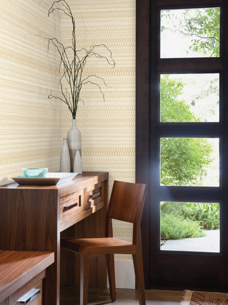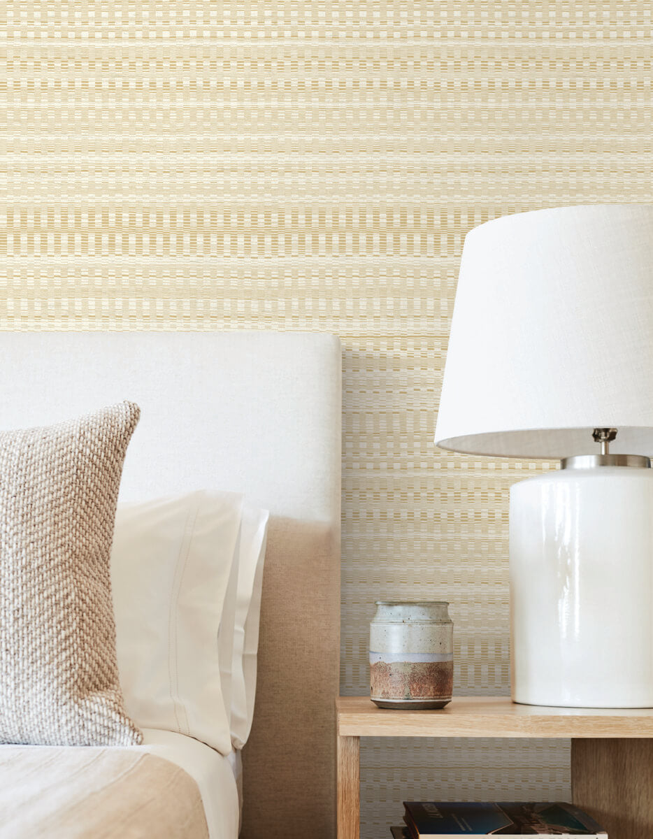 The decorative raised Tapestry Stitch is the cornerstone of hand-loomed textile wall art, synonymous with classic luxury and artisanal craftsmanship shown in mustard yellow on white. This Tapestry Stitch Wallpaper measures approximately 27 inches wide by 27 feet long, measuring approximately 60.8 square feet per roll. The modern aesthetic of natural form.