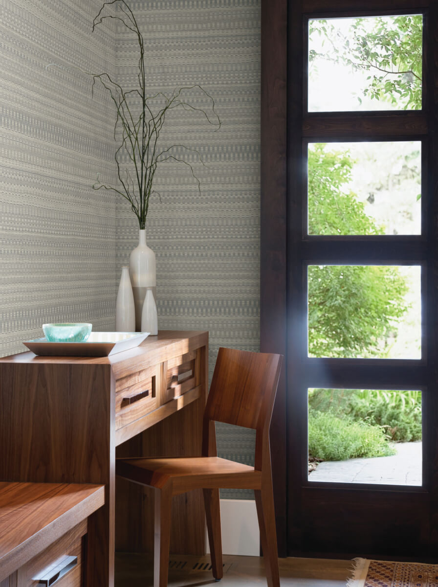 The decorative raised Tapestry Stitch is the cornerstone of hand-loomed textile wall art, synonymous with classic luxury and artisanal craftsmanship, shown in charcoal; gray on linen beige. This Tapestry Stitch Wallpaper measures approximately 27 inches wide by 27 feet long, measuring approximately 60.8 square feet per roll. The modern aesthetic of natural form.