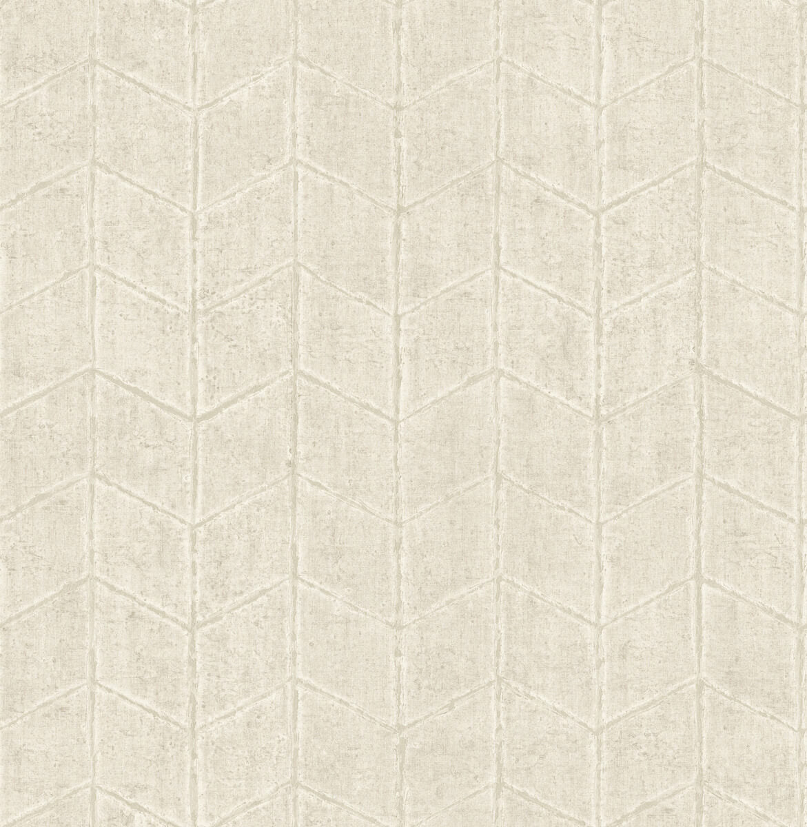 The chevron gets a modern, industrial upgrade when stylized with raised textural plaster relief and metallic in the pattern Flatiron Geometric, shown in oyster white and sandy beige. This Flatiron Geometric Wallpaper measures approximately 20.5 inches wide by 33 feet long, measuring approximately 56.4 square feet per roll. The modern aesthetic of natural form.