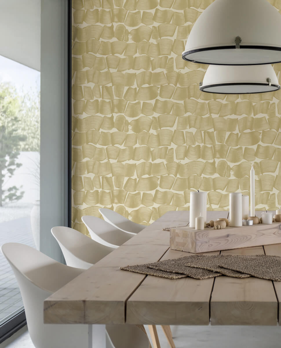 The Brushed Ink and broad, swaying horizontal strokes of Shodo calligraphy inspire a pattern of artistic expression with cultural tradition, shown in golden yellow on a beige canvas. This Brushed Ink Wallpaper measures approximately 27 inches wide by 27 feet long, measuring approximately 60.8 square feet per roll. The modern aesthetic of natural form.