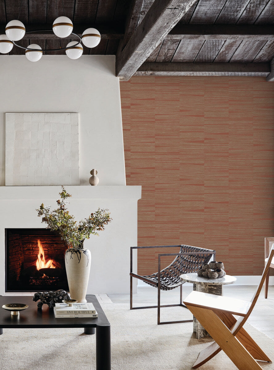 Line Stripe’s narrow panels form strips that mimic the look of nature-inspired horizontal grasscloths’ organic fibers, shown in brick red on ivory white. This Line Stripe Wallpaper measures approximately 27 inches wide by 27 feet long, measuring approximately 60.8 square feet per roll. The modern aesthetic of natural form.