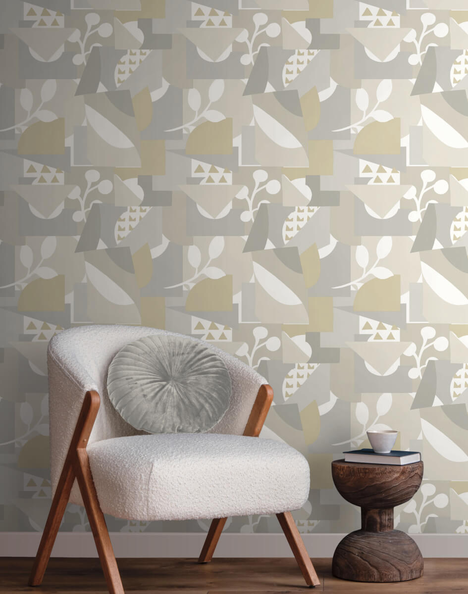 Expressionism finds the purity of simplicity in composition when fine art Cut Outs emerge as a new color block form of abstraction, shown in neutral beige, putty gray and flax yellow. This Cut Outs Wallpaper measures approximately 27 inches wide by 27 feet long, measuring approximately 60.8 square feet per roll. The modern aesthetic of natural form.