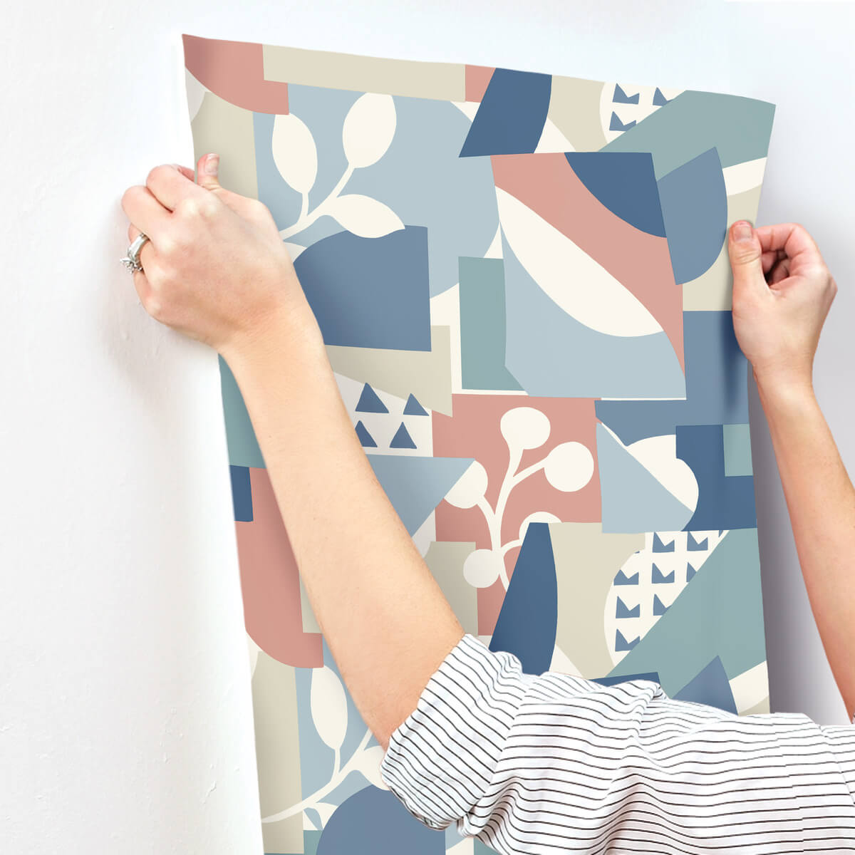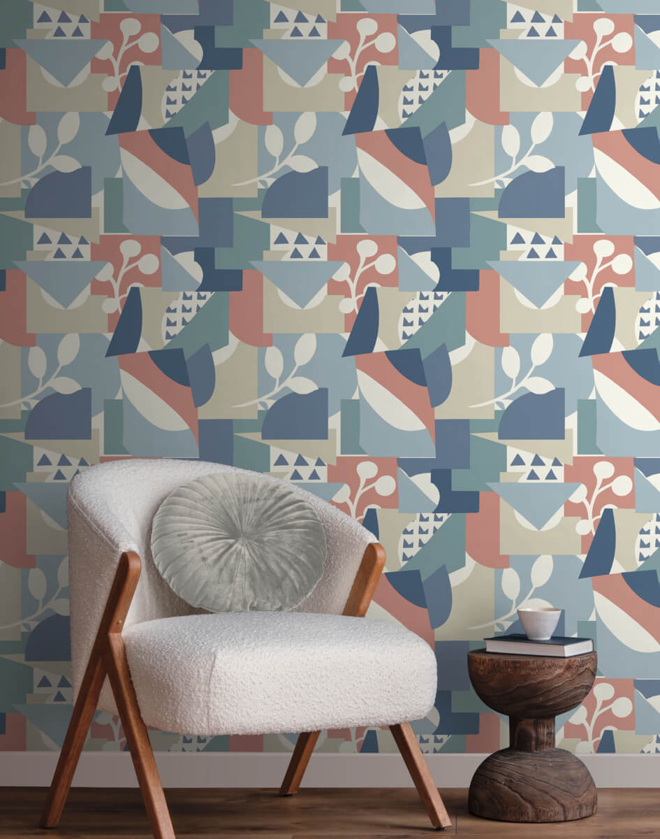 Expressionism finds the purity of simplicity in composition when fine art Cut Outs emerge as a new color block form of abstraction., shown indeim blue with coral pink. This Cut Outs Wallpaper measures approximately 27 inches wide by 27 feet long, measuring approximately 60.8 square feet per roll. The modern aesthetic of natural form.