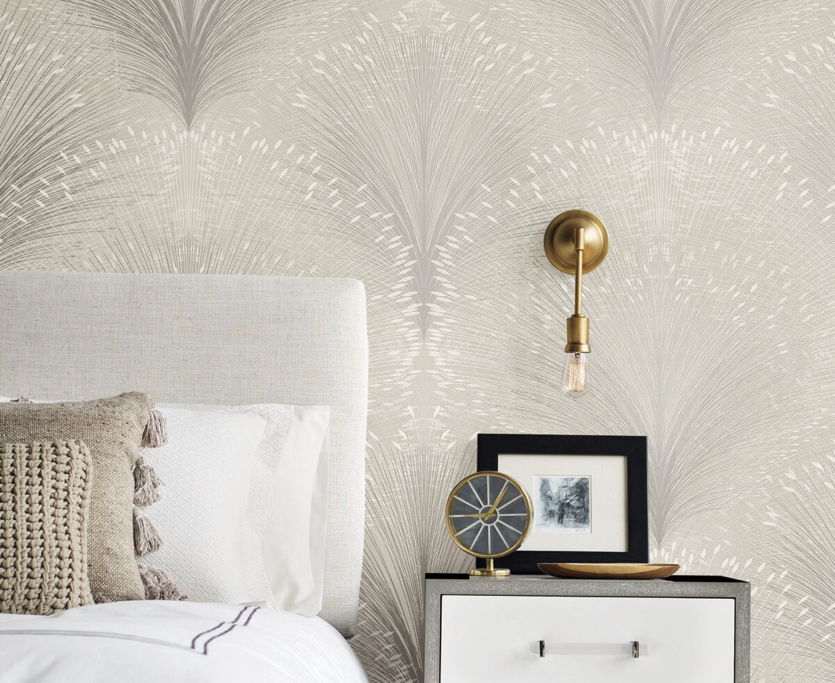 Layered sheaths of stems provide an organic bouquet in homage to this ancient natural wetland grass in Papyrus Plume, shown in grey with pewter metallic. This Papyrus Plume Wallpaper measures approximately 27 inches wide by 27 feet long, measuring approximately 60.8 square feet per roll. The modern aesthetic of natural form.