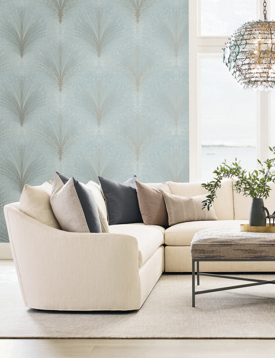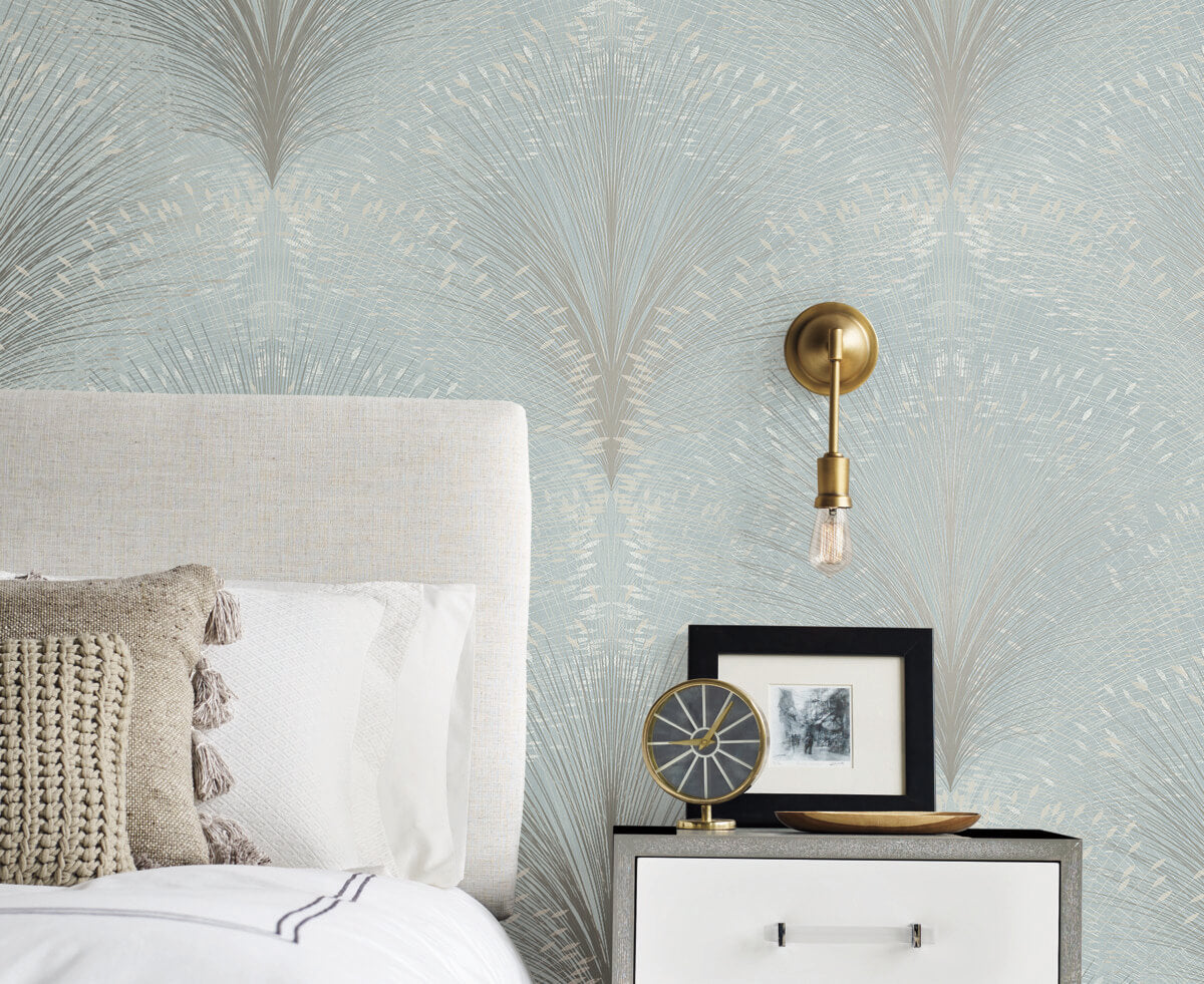 Layered sheaths of stems provide an organic bouquet in homage to this ancient natural wetland grass in Papyrus Plume, shown in sky blue with nickel metallic. This Papyrus Plume Wallpaper measures approximately 27 inches wide by 27 feet long, measuring approximately 60.8 square feet per roll. The modern aesthetic of natural form.