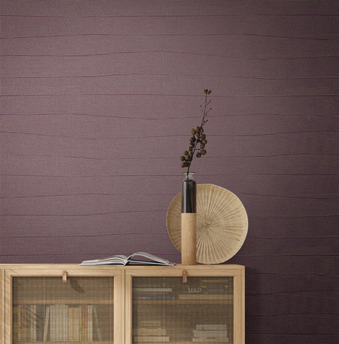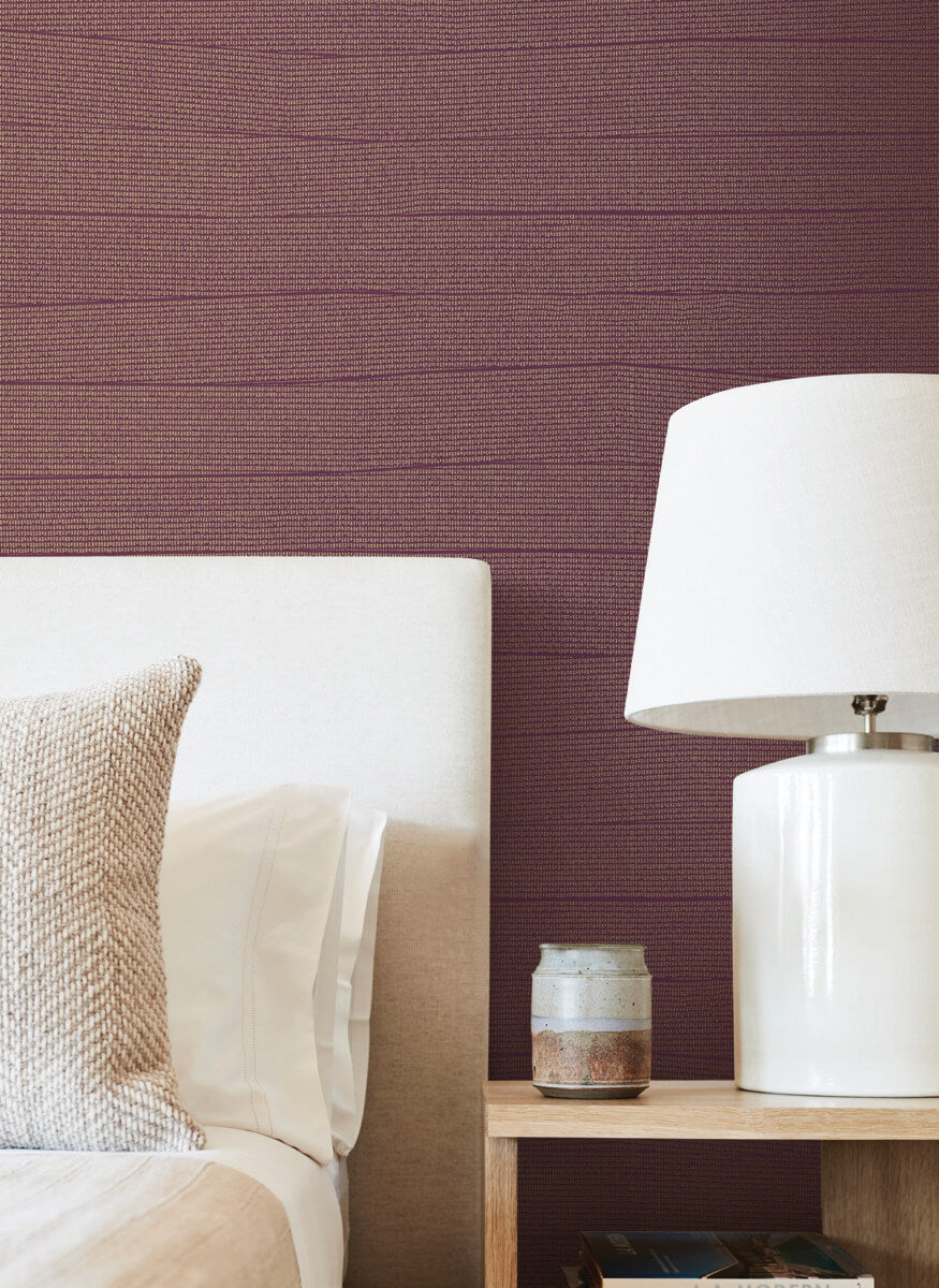Horizontal strips of grillwork create a modern lattice with nuances of pattern on color in Natural Grid, shown in mulberry red with gold metallic. This Natural Grid Wallpaper measures approximately 27 inches wide by 27 feet long, measuring approximately 60.8 square feet per roll. The modern aesthetic of natural form.
