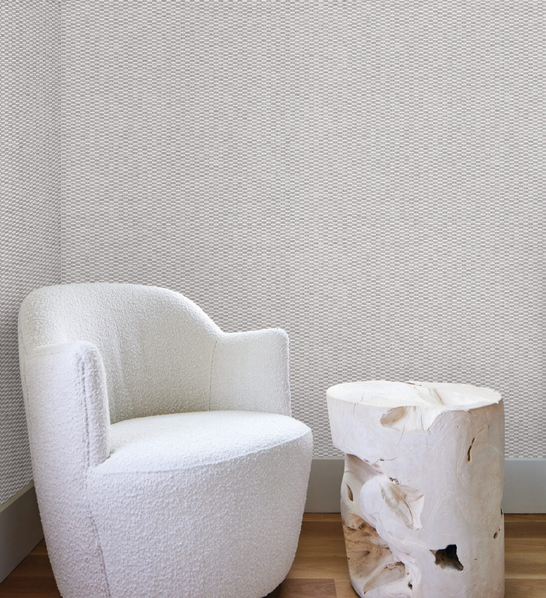 The loomed rectangles in the pattern Checkerboard create a deep textural paperweave that combines woven elegance with geometric purity of line, shown in white with black stitching. This Checkerboard Wallpaper measures approximately 36 inches wide by 24 feet long, measuring approximately 72 square feet per roll. The modern aesthetic of natural form.