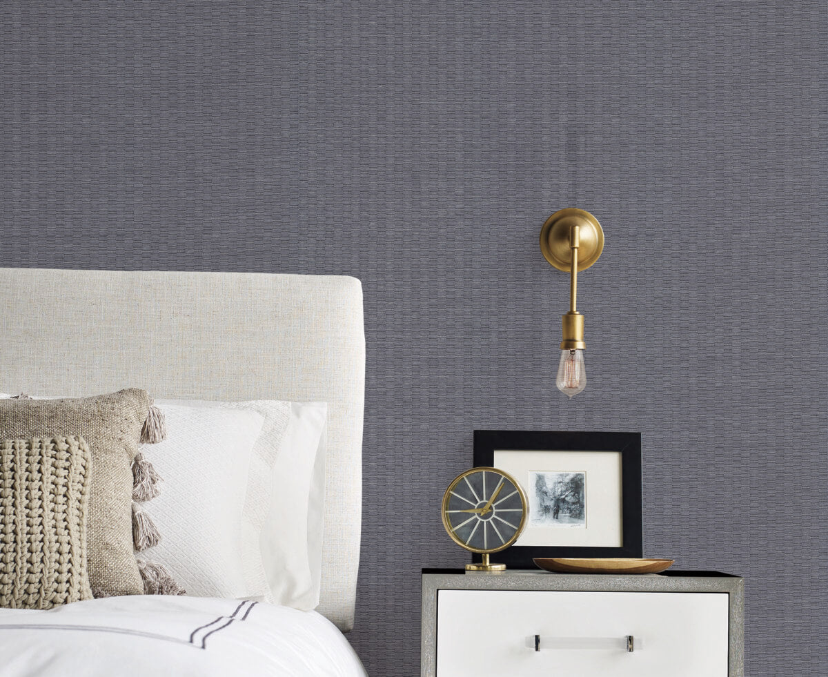 The loomed rectangles in the pattern Checkerboard create a deep textural paperweave that combines woven elegance with geometric purity of line, shown in indigo with white stitching. This Checkerboard Wallpaper measures approximately 36 inches wide by 24 feet long, measuring approximately 72 square feet per roll. The modern aesthetic of natural form.