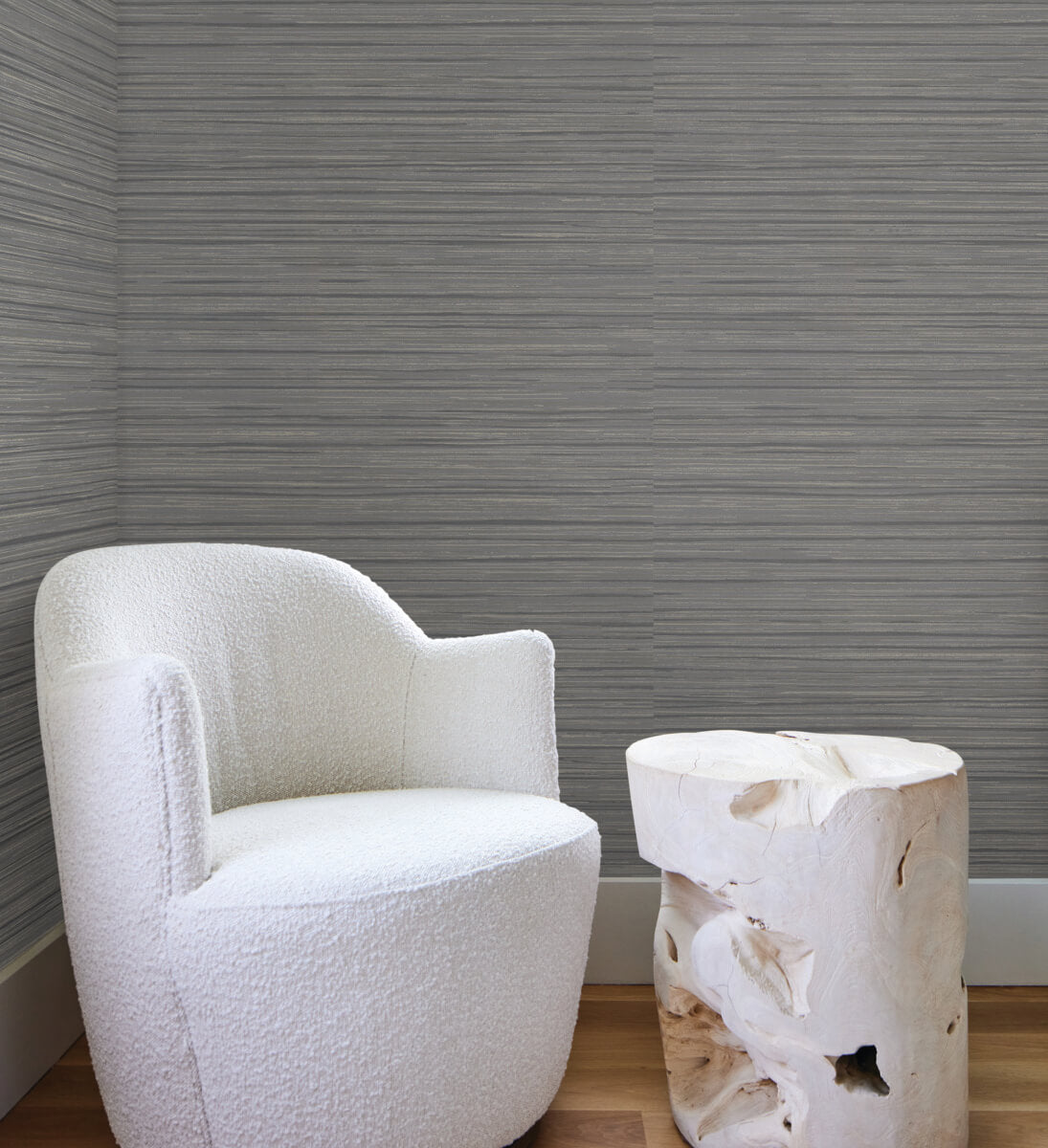 Scenic views of stratified rock and ravine inspire the raised painterly geometric texture of horizontal pattern Vista, shown in charcoal gray with smoky gray. This Vista Wallpaper measures approximately 27 inches wide by 27 feet long, measuring approximately 60.8 square feet per roll. The modern aesthetic of natural form.