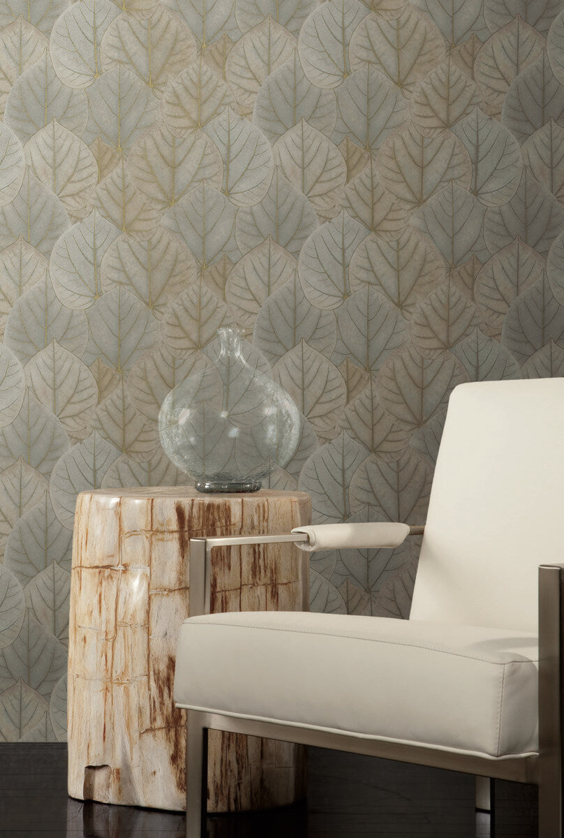 A forest of leaves, aglow with veined metallic, creates a patchwork composition of natural color in pattern Leaf Concerto. Designer Candice Olson's exceptional design signature continues to reflect the breathtaking color, elegance and patterns of the natural world in this second edition of her best selling fine wallpaper collection Modern Nature.