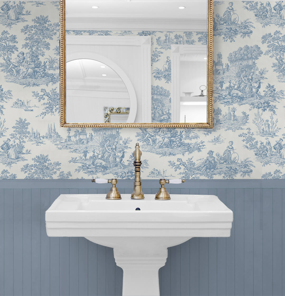 Featuring a playful Chateau Toile pattern in navy and sky blue, this wallpaper adds a touch of whimsy to any space. New pre-pasted wallpaper patterns by Seabrook Designs. Super easy to install, simply submerge in water and apply.