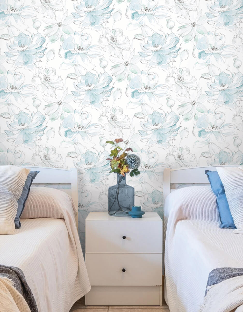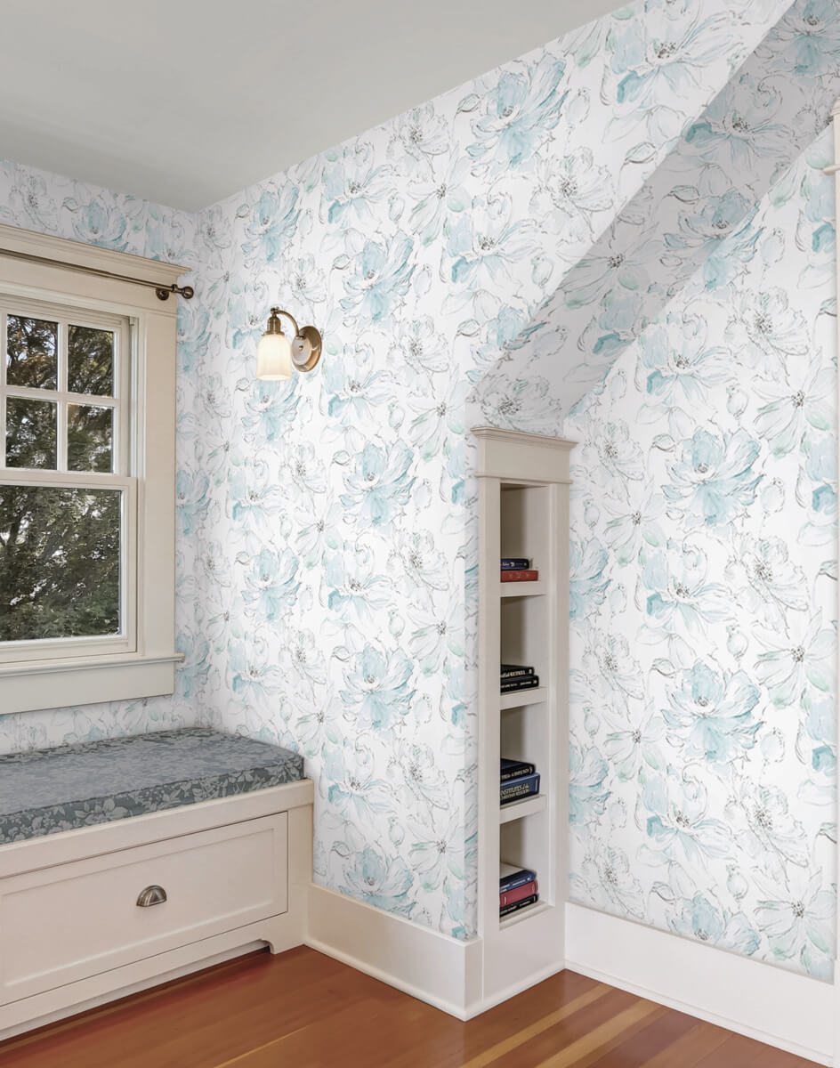 Sketches from the garden display a lively toss of romantic heirloom blooms in pattern Floral Dreams, shown in mineralgreen on white. This Floral Dreams Peel and Stick Wallpaper measures approximately 20.5 inches wide by 20 feet long, measuring approximately 34.2 square feet per roll. Painterly illustrations of meadows, gardens, and greenery. Painterly illustrations of meadows, gardens, and greenery.