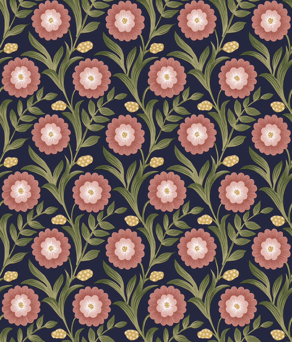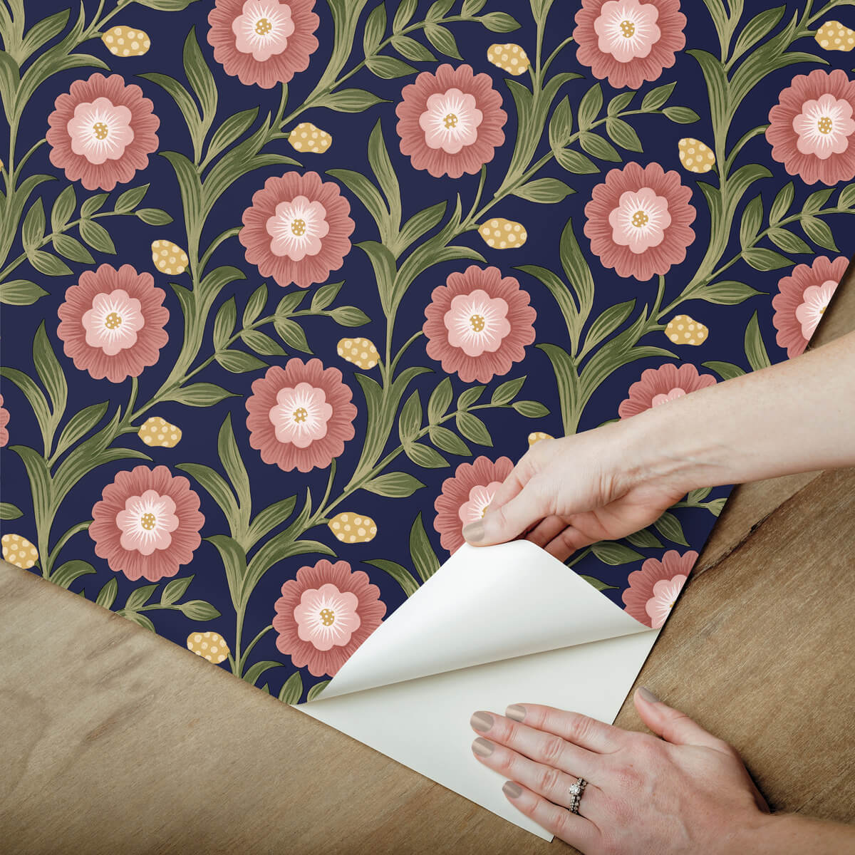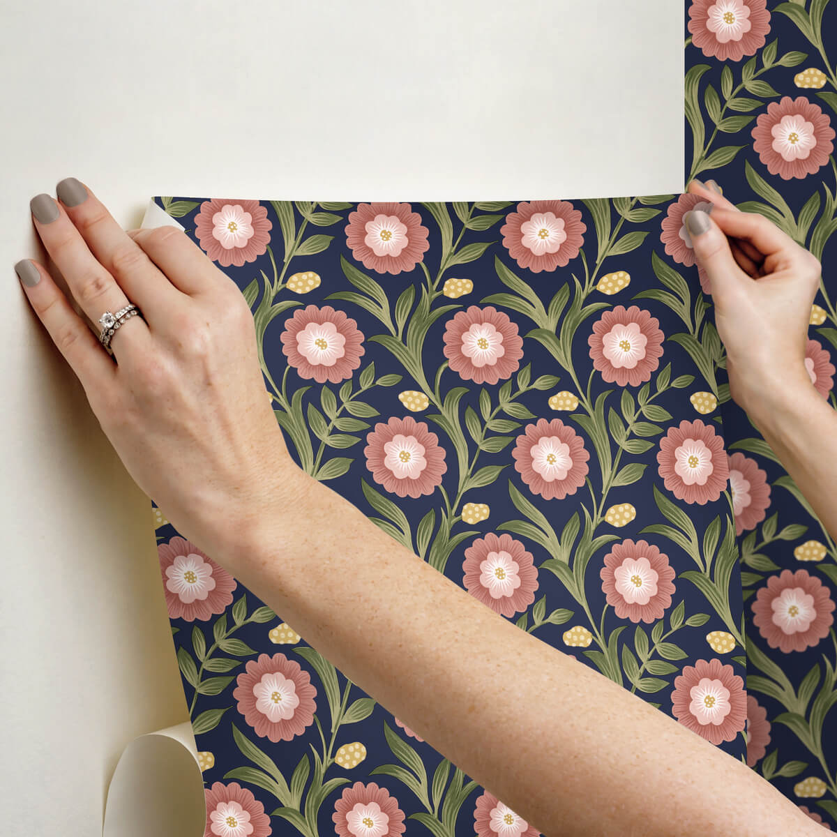 This organic yet uniform floral features winding, leafy green vines dotted with cheerful, circular pink blooms illustrated against a deep blue background. This Lillian Premium Peel + Stick Wallpaper measures approximately 20.5 inches wide by 20 feet long, measuring approximately 34.2 square feet per roll. Mirth Studio's delightful, hand-painted stylings make their debut on peel + stick wallpaper with this whimsical collection of botanical and bohemian designs.
