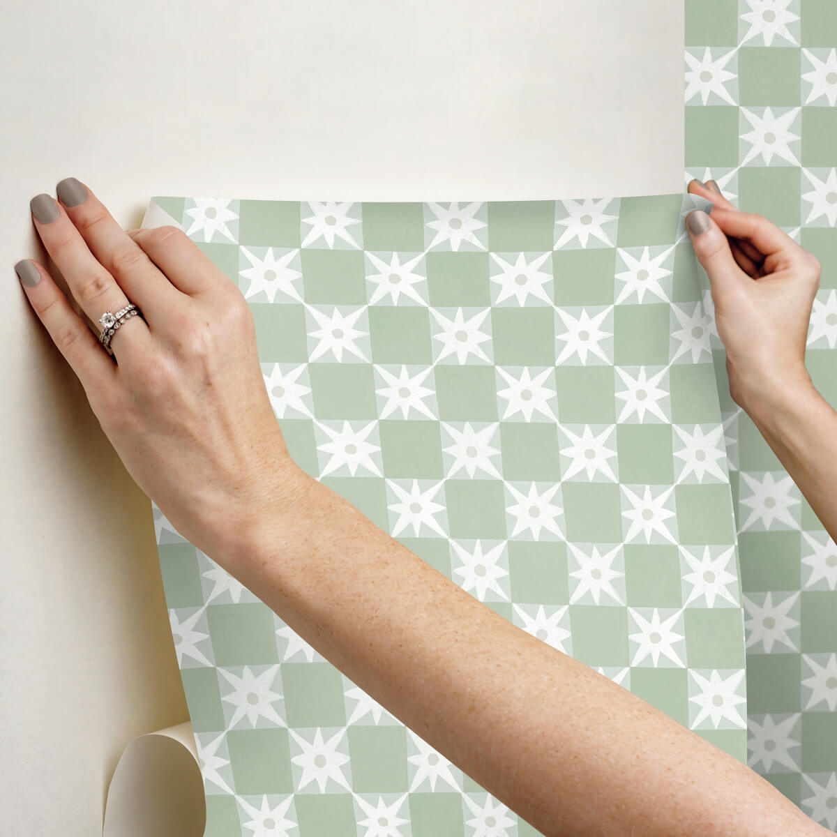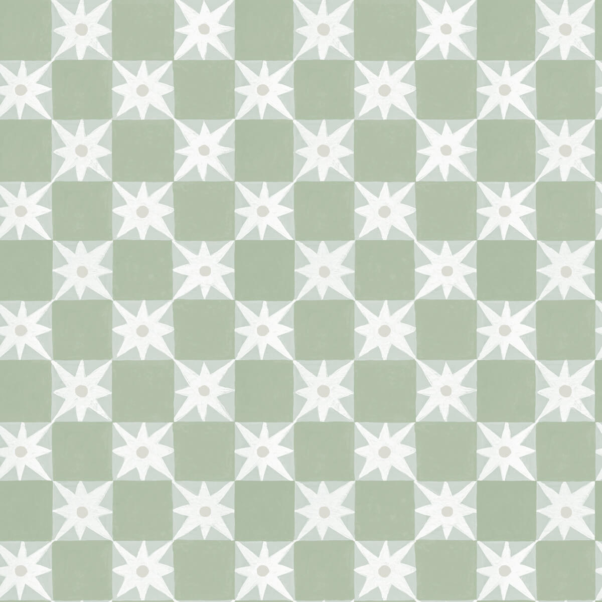 Whimsical, hand drawn white stars with a silver center add embellishment to a green checkerboard grid. This Stardust Premium Peel + Stick Wallpaper measures approximately 20.5 inches wide by 20 feet long, measuring approximately 34.2 square feet per roll. Mirth Studio's delightful, hand-painted stylings make their debut on peel + stick wallpaper with this whimsical collection of botanical and bohemian designs.