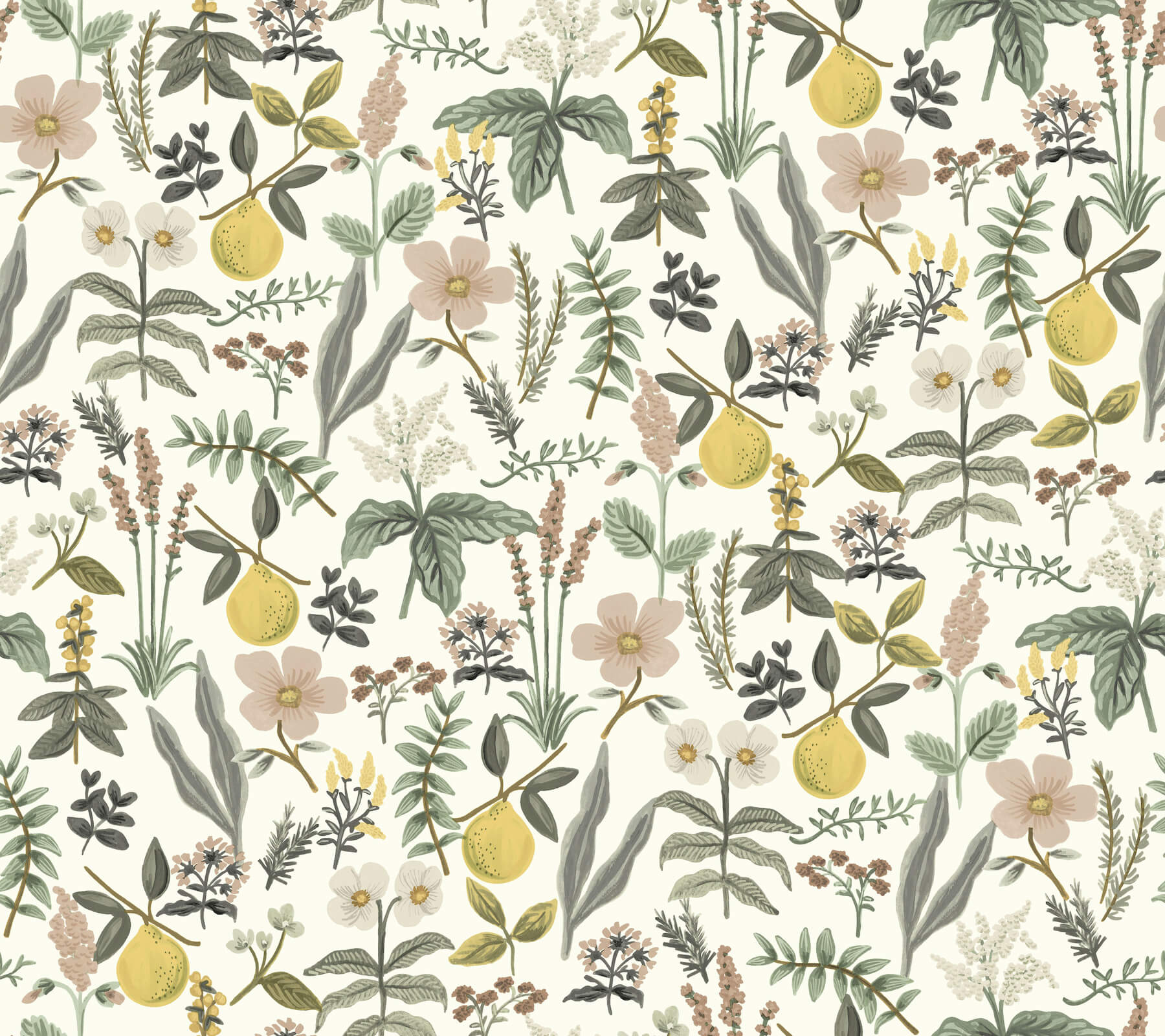 Fruit, wildflowers, and sprigs of herbs weave throughout this delicate pattern, inspired by the treasures of a coastal garden. Featured here in sage, moss, grey, chartreuse, blush, pale yellow, and ochre against white. Herb Garden is a peel and stick, non woven wallpaper measuring 27 inches wide by 20 feet long, covering approximately 45 square feet per roll. Bring signature Rifle Paper Co. style to your walls with the Premium Peel and Stick Wallpaper Collection 5 where art and design meet everyday living. These removable wallpapers feature the brand's iconic floral patterns, elegant line work, and whimsical illustrations, creating a bright and beautiful way to refresh any space.