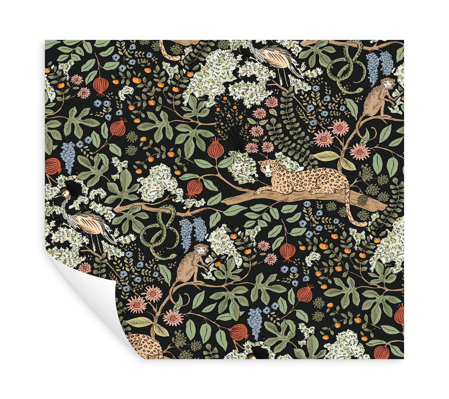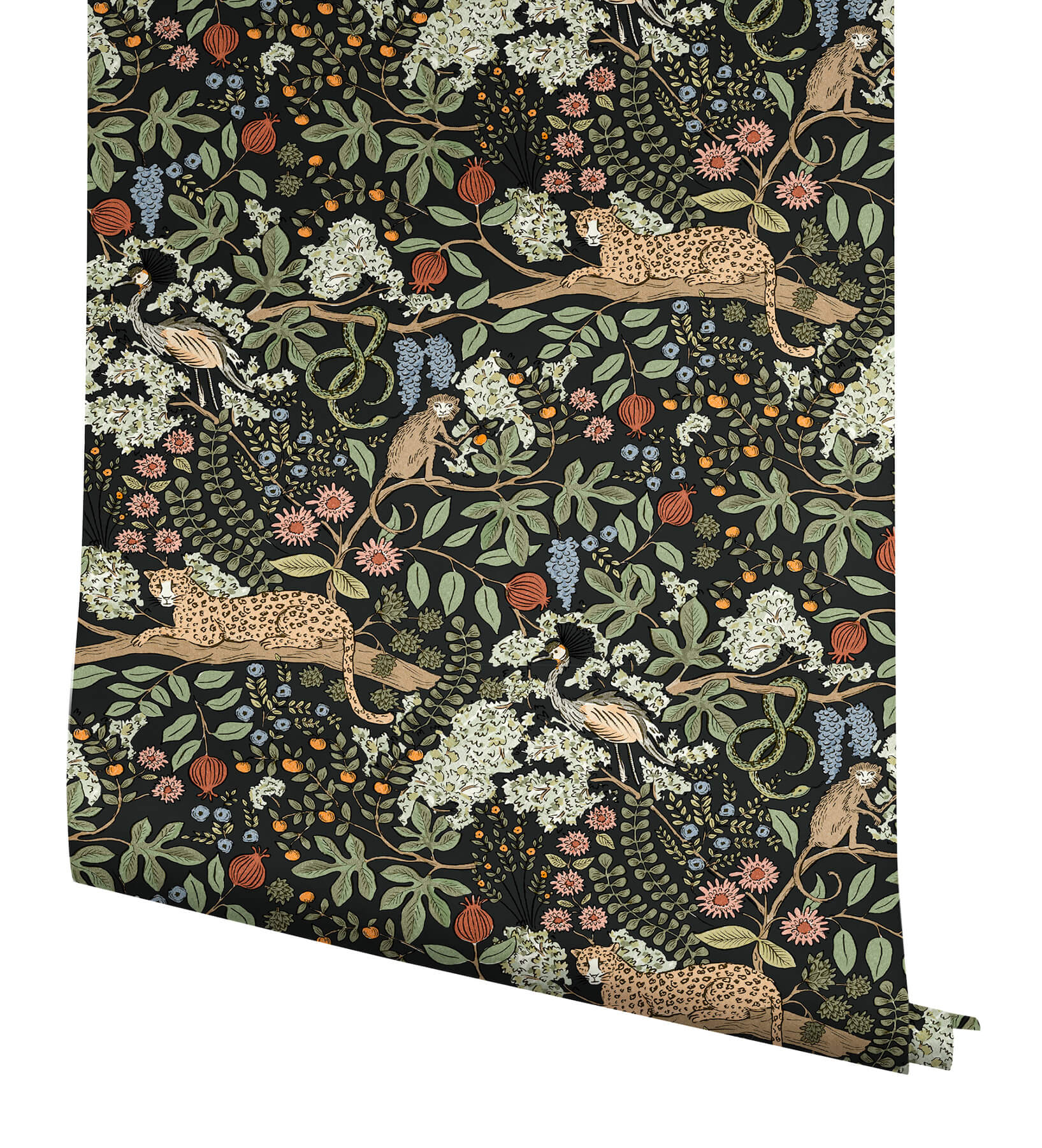 Inspired by visions of old-world travel, Safari is an ink-drawn pattern featuring wild animals, winding vines, and intriguing details. Featured here in shades of green, blues, pink, red, orange, beige, and brown against black. Safari is a peel and stick, non woven wallpaper measuring 27 inches wide by 20 feet long, covering approximately 45 square feet per roll. Bring signature Rifle Paper Co. style to your walls with the Premium Peel and Stick Wallpaper Collection 5 where art and design meet everyday living. These removable wallpapers feature the brand's iconic floral patterns, elegant line work, and whimsical illustrations, creating a bright and beautiful way to refresh any space.