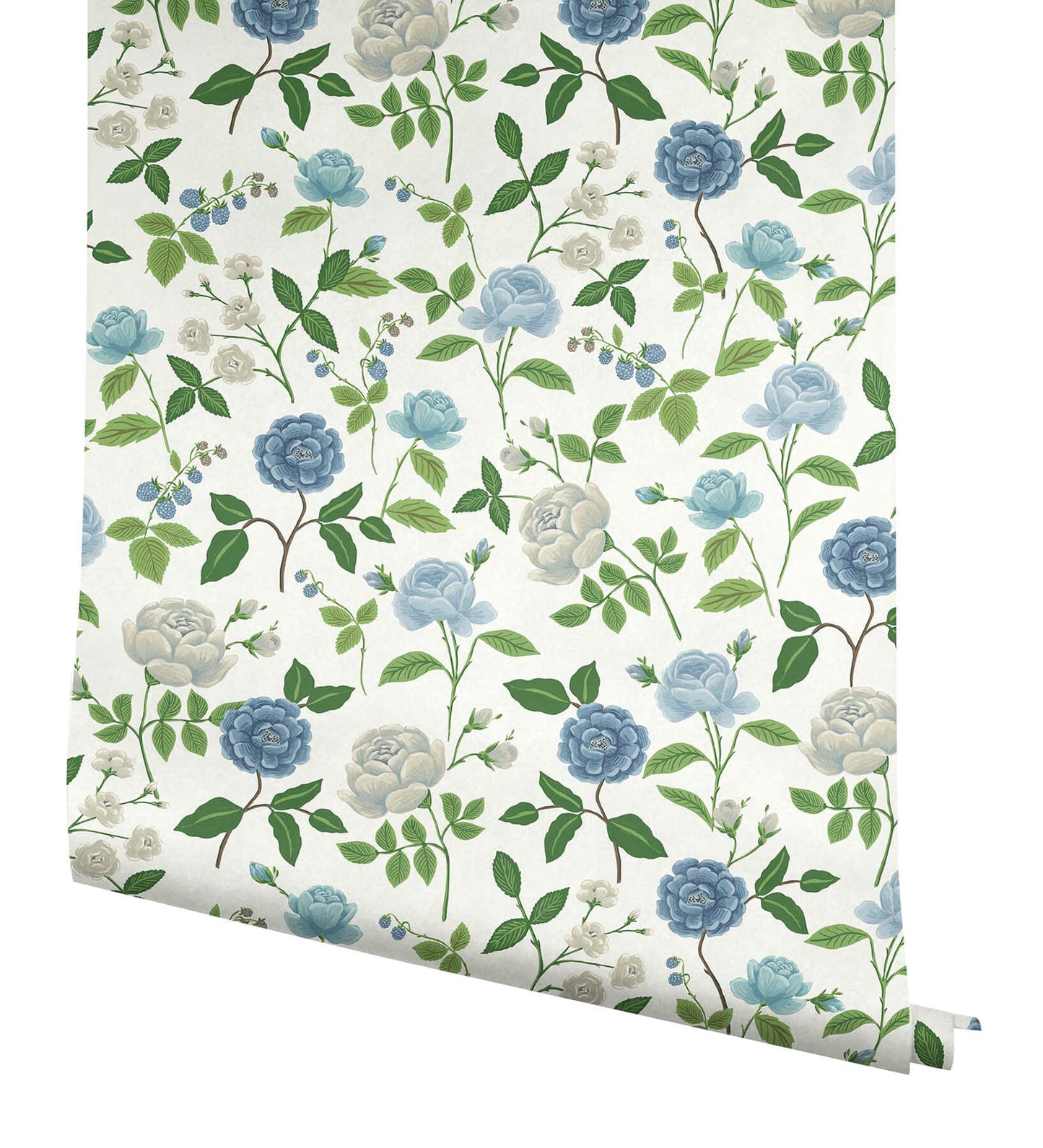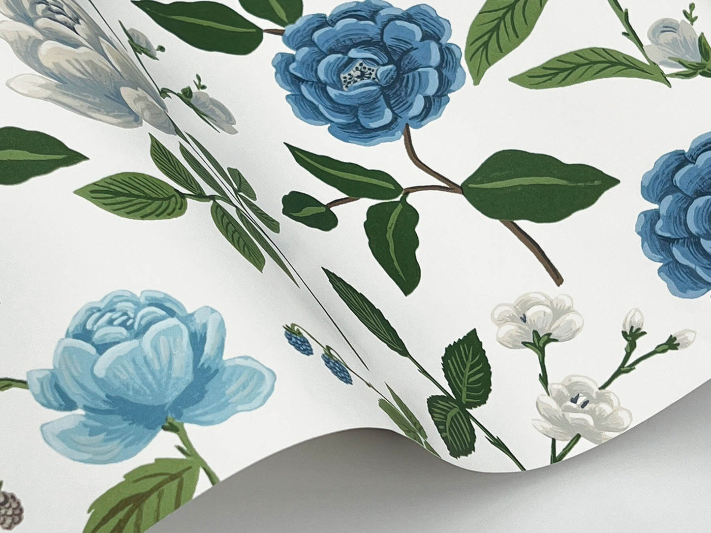 Inspired by vintage botanical drawings, Roses is a timeless pattern filled with layered details, classic colors, and playful stems of raspberries. Illustrated in shades of pale blue, delicate grey, and rich greens against a cool white backdrop. This Roses Wallpaper measures approximately 27 inches wide by 27 feet long, measuring approximately 60.8 square feet per roll. The world of Rifle Paper Co. is in full bloom with their third wallpaper collection. With statement floral prints, detailed illustrated designs, and metallic accents, this collection is designed to bring beauty to every room.