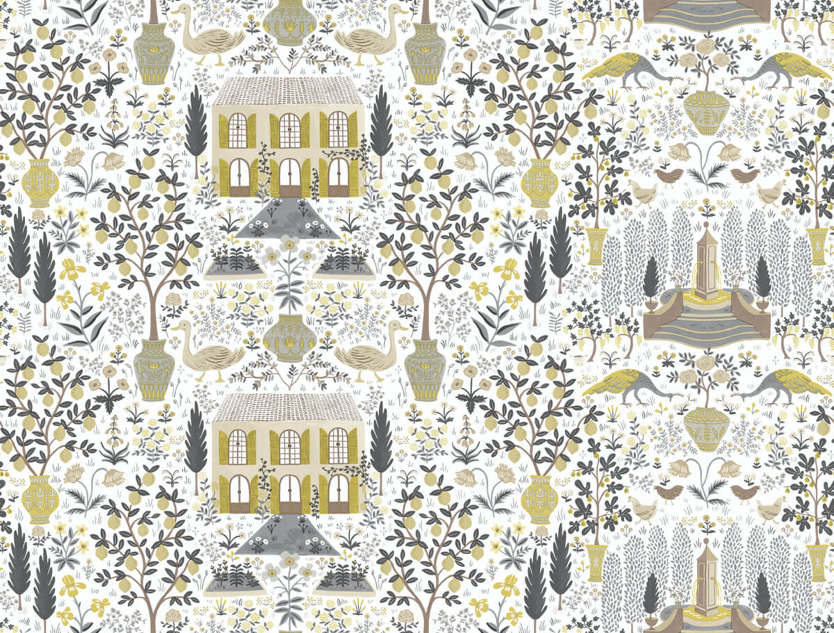 Inspired by a property of the same name in Gascony, France and an antique pattern from York's archives, the Rifle Paper Co. Camont print features an illustration of an 18th century French farmhouse and the fig trees, lemon trees, animals and flowers of it's pastoral grounds. The debut collection from Rifle Paper Co. is timeless, inviting, and filled with their signature florals, expressive illustrations, and custom-colored sisals - each designed to bring unexpected beauty into the real world.