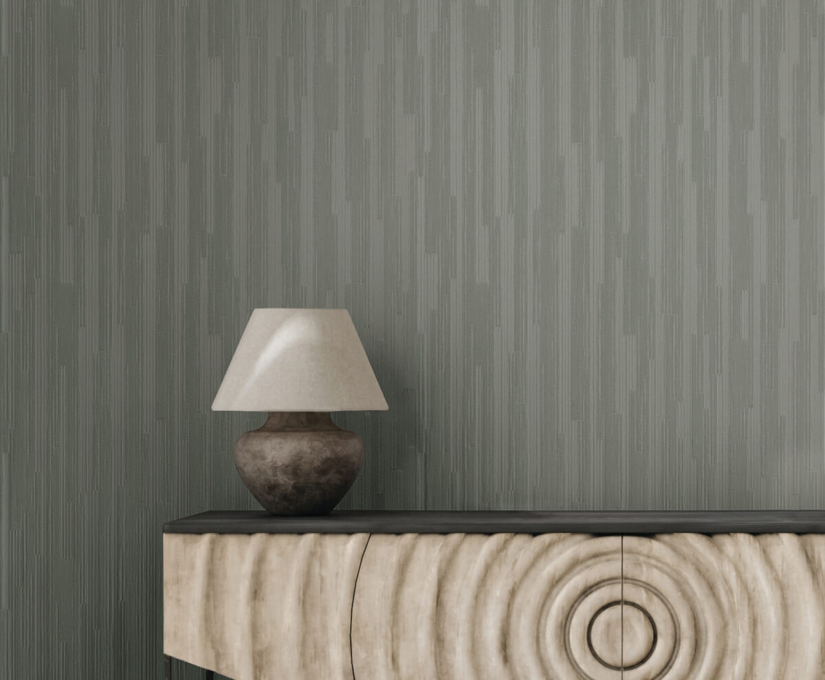 Thick and thin, deeply striated vertical lines and wide bars alternate and step out with mechanical precision in the stripe pattern Newel, shown in nickel gray . This Newel Wallpaper measures approximately 26 inches wide by 30 feet long, measuring approximately 65 square feet per roll. Designed for function, industrial manufacturing’s unmistakable elements evolve to become the distinctive characteristics of a new philosophy of informal, modern sophistication of style.