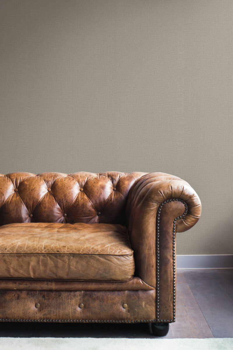 The rustic threads of pattern Rugged Linen highlight the textural slubs and irregularities inherent in hand-loomed cloth in this iconic classic weave, shown in linen with tan brown. This Rugged Linen Wallpaper measures approximately 27 inches wide by 27 feet long, measuring approximately 60.8 square feet per roll. Designed for function, industrial manufacturing’s unmistakable elements evolve to become the distinctive characteristics of a new philosophy of informal, modern sophistication of style.