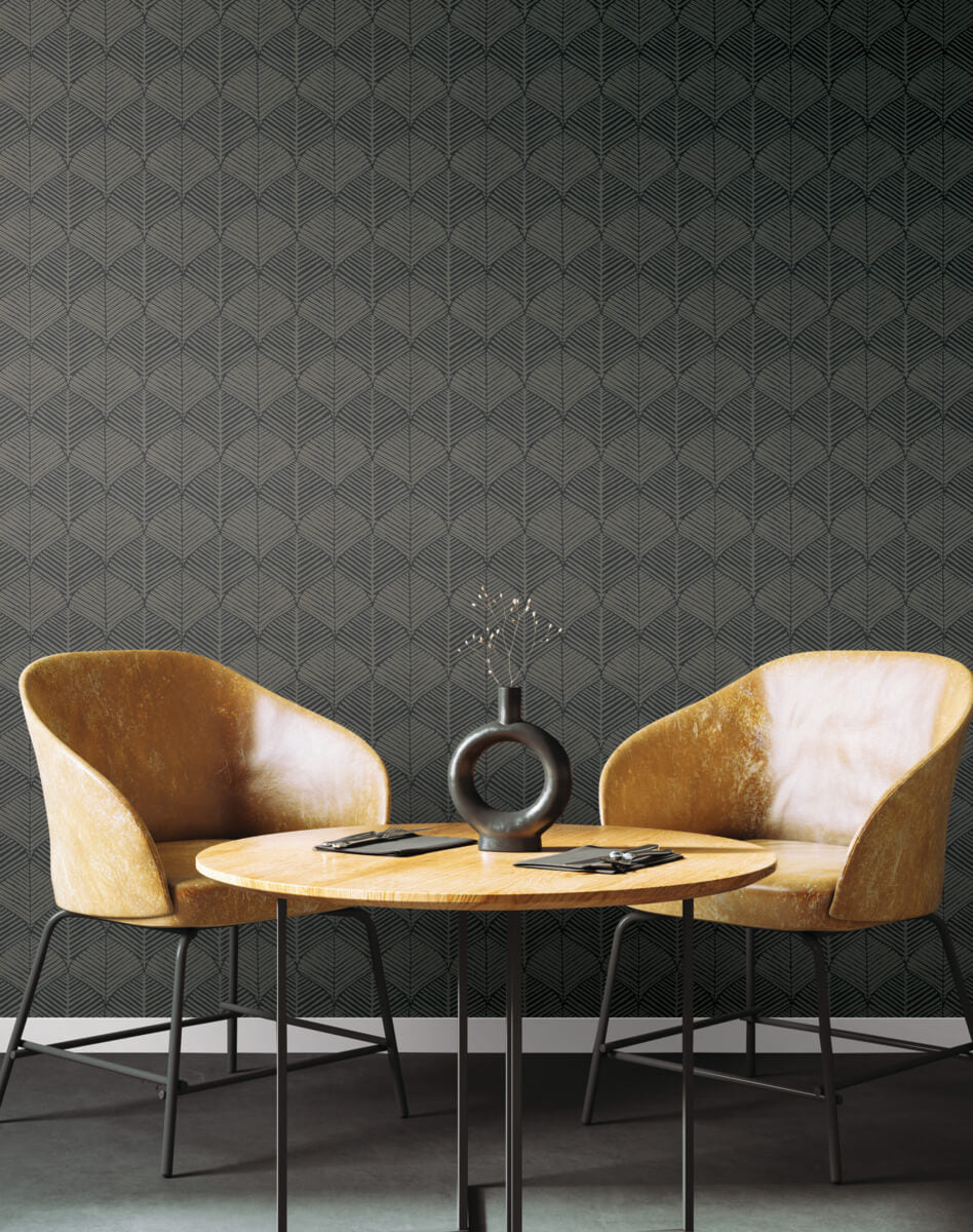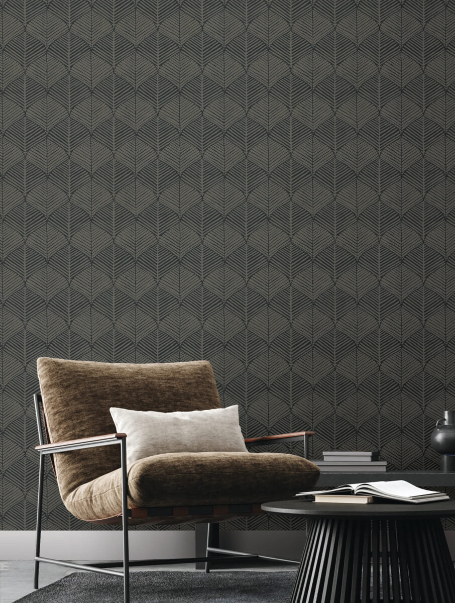Wide palm frond silhouettes create an allover pattern in mirrored veins and leaves with a raised texture that defines the design of Universal Nature, shown in raised shadow black. This Universal Nature Wallpaper measures approximately 27 inches wide by 27 feet long, measuring approximately 60.8 square feet per roll. Designed for function, industrial manufacturing’s unmistakable elements evolve to become the distinctive characteristics of a new philosophy of informal, modern sophistication of style.