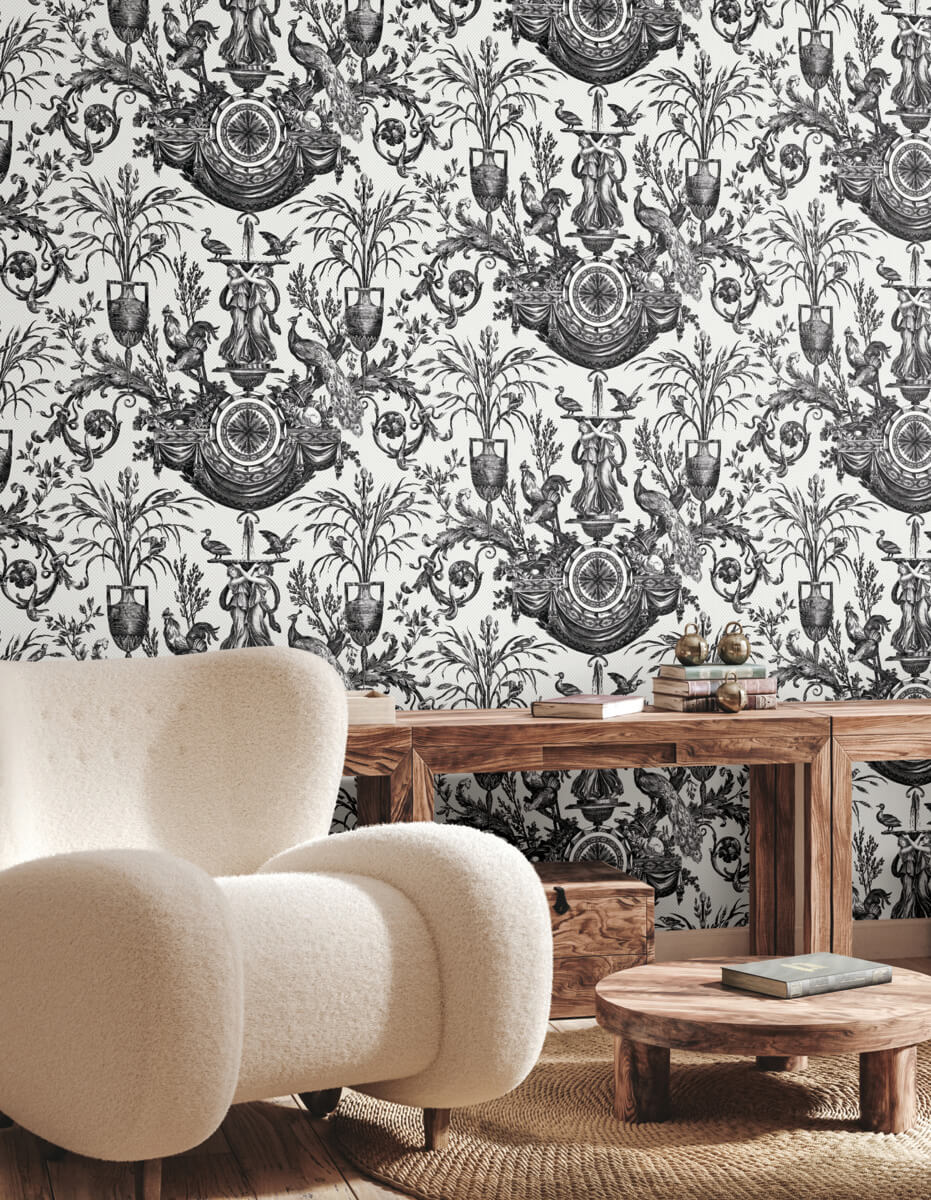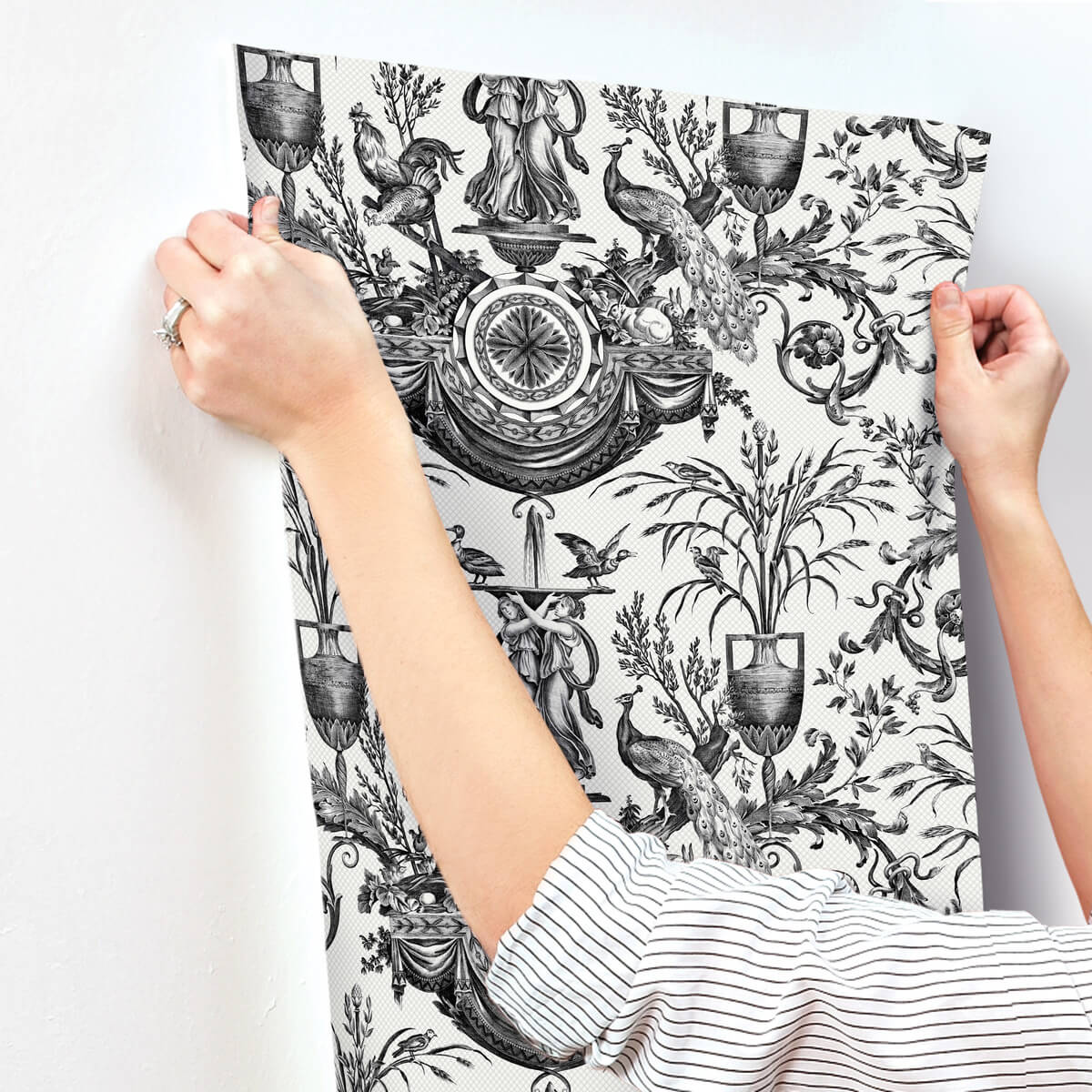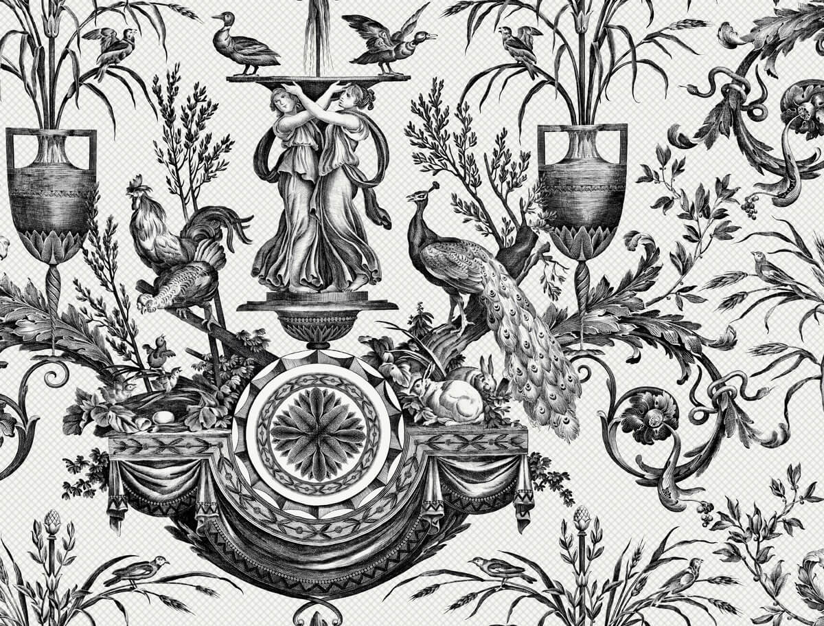 The fountain maidens and surrounding wildlife of Avian Fountain Toile are intricately illustrated in black against a white backdrop with delicate grid detailing. This Avian Fountain Toile Wallpaper measures approximately 27 inches wide by 27 feet long, measuring approximately 60.8 square feet per roll. The quintessential design for timeless romance, toile (pronounced ‘twall’) traces its origins to 18th century fabrics. This celebrated motif is explored with a range of classical reproductions and modern reimaginings.