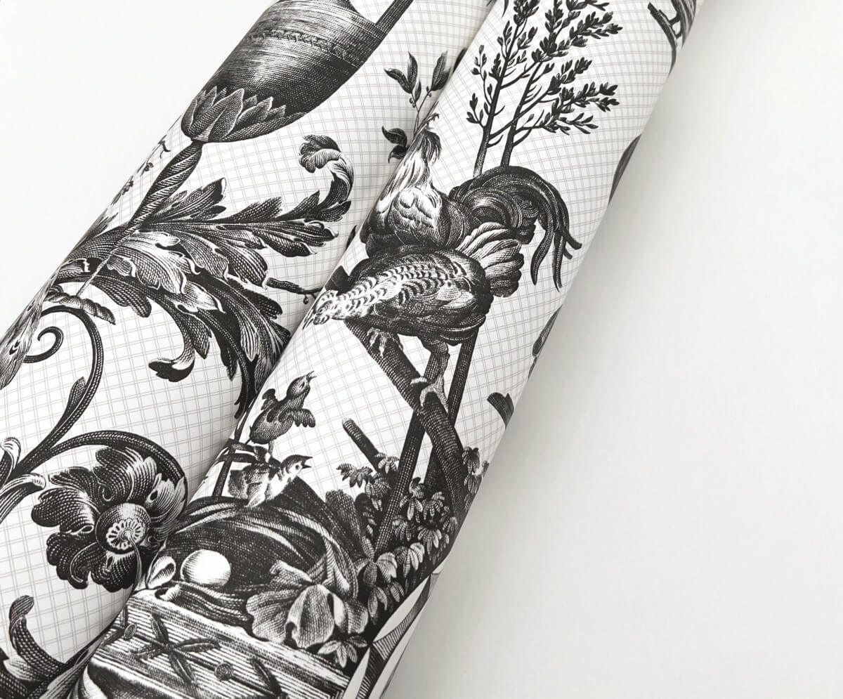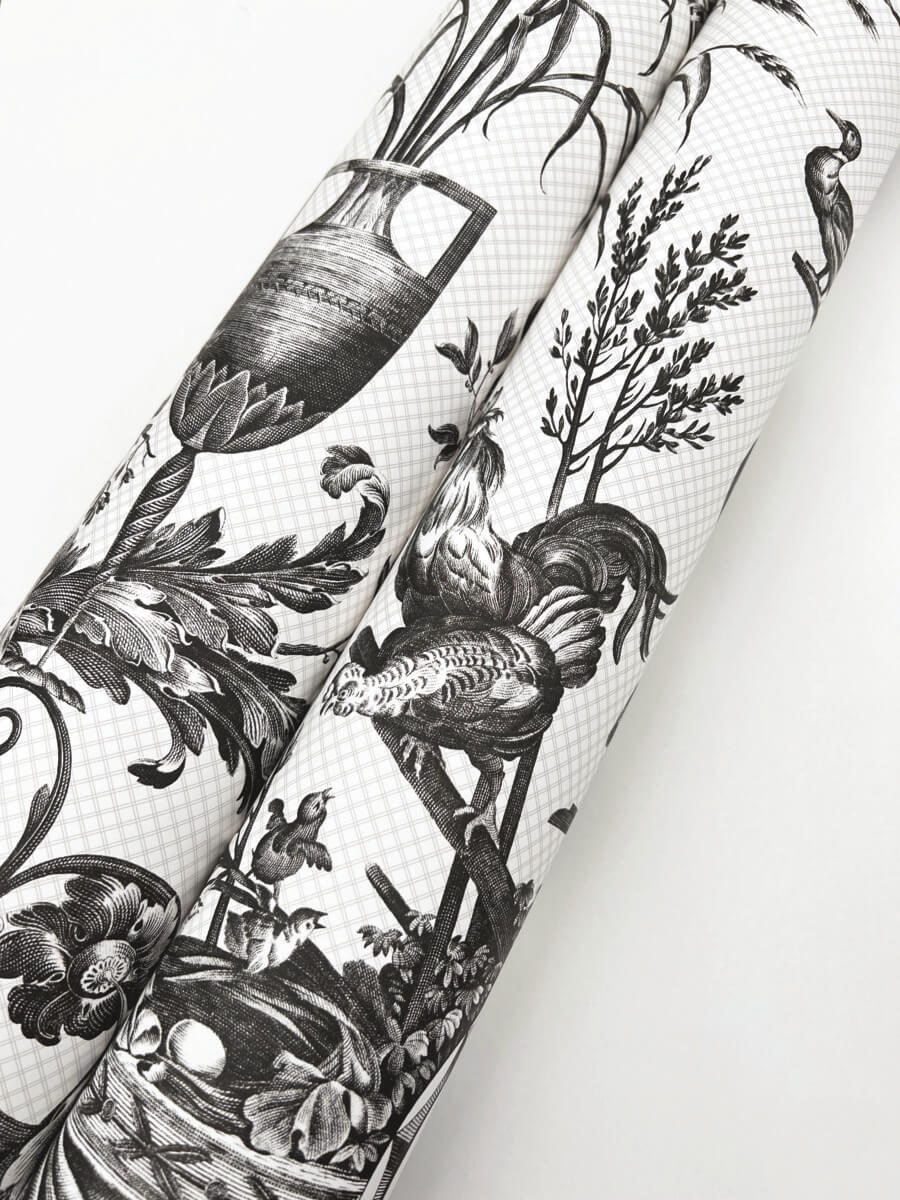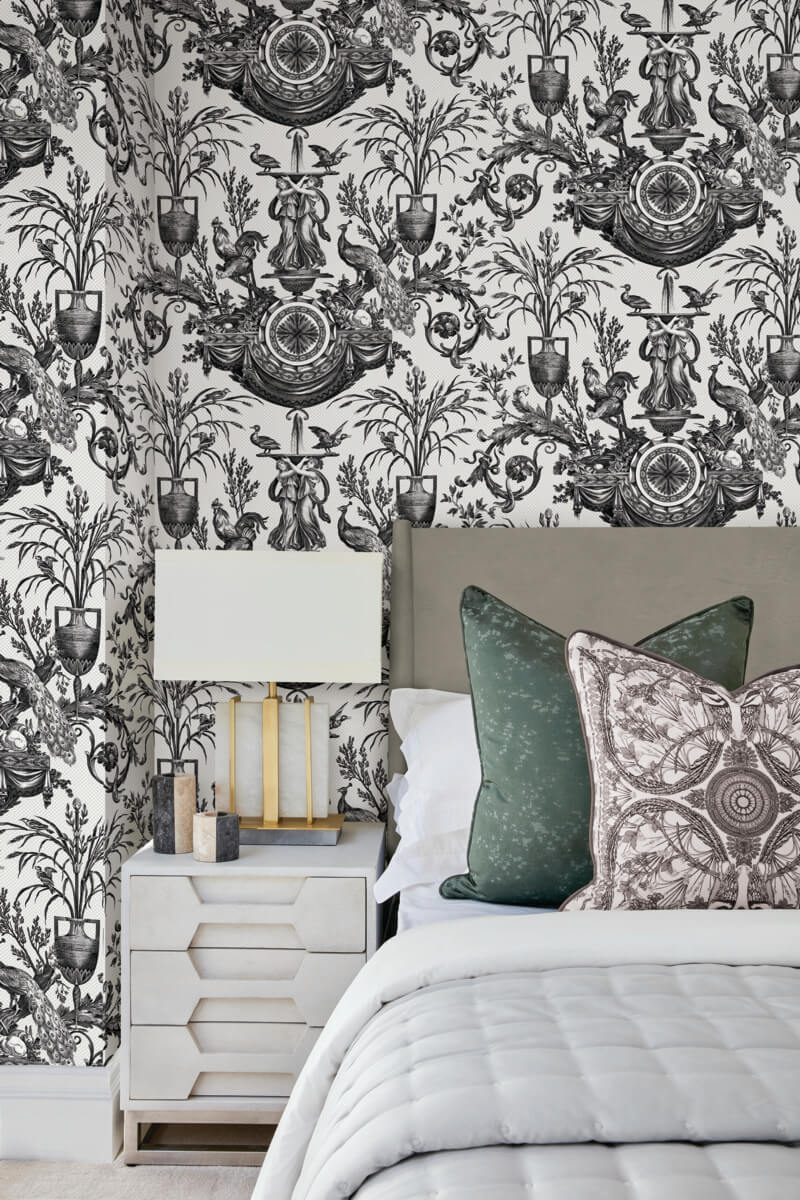 The fountain maidens and surrounding wildlife of Avian Fountain Toile are intricately illustrated in black against a white backdrop with delicate grid detailing. This Avian Fountain Toile Wallpaper measures approximately 27 inches wide by 27 feet long, measuring approximately 60.8 square feet per roll. The quintessential design for timeless romance, toile (pronounced ‘twall’) traces its origins to 18th century fabrics. This celebrated motif is explored with a range of classical reproductions and modern reimaginings.