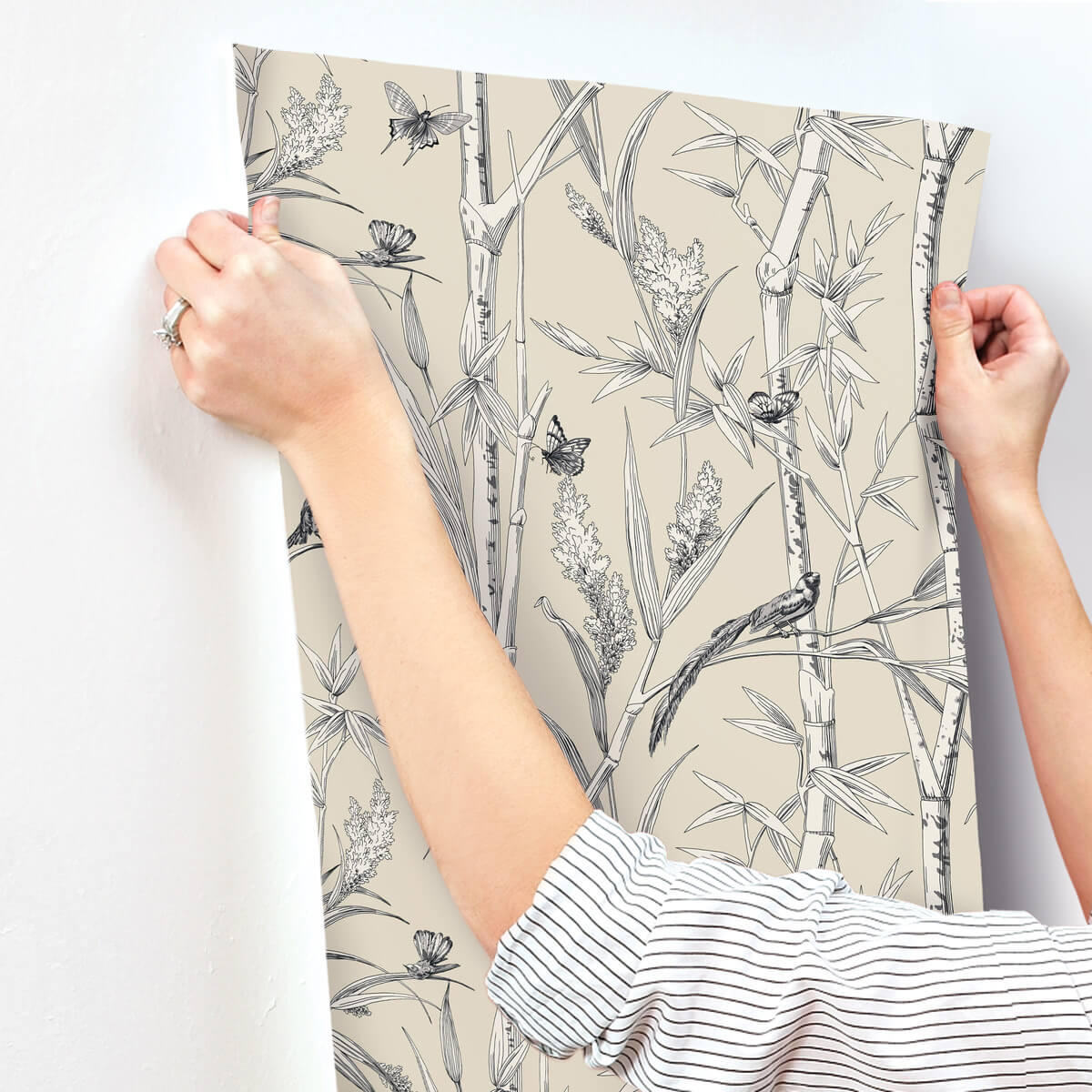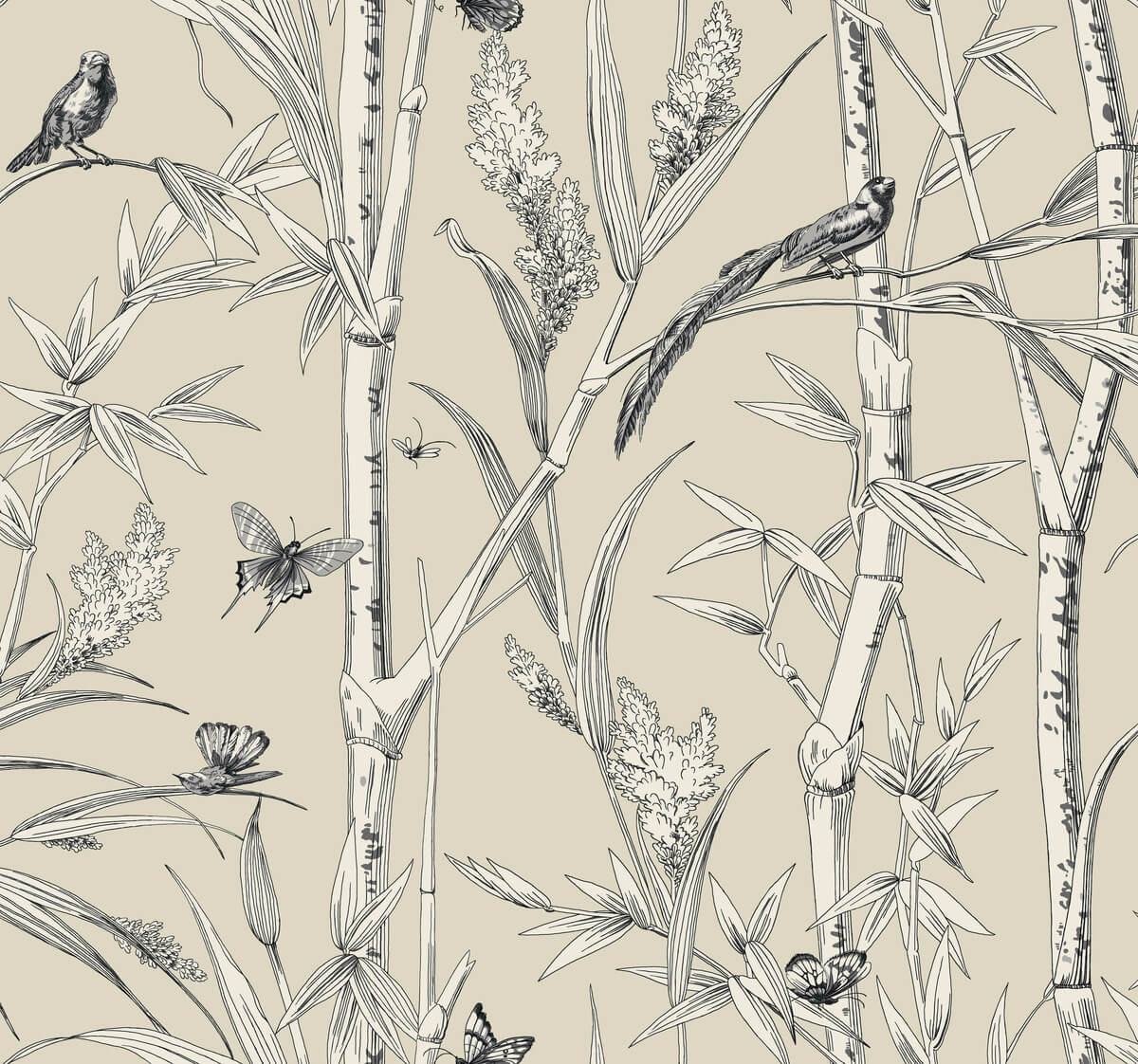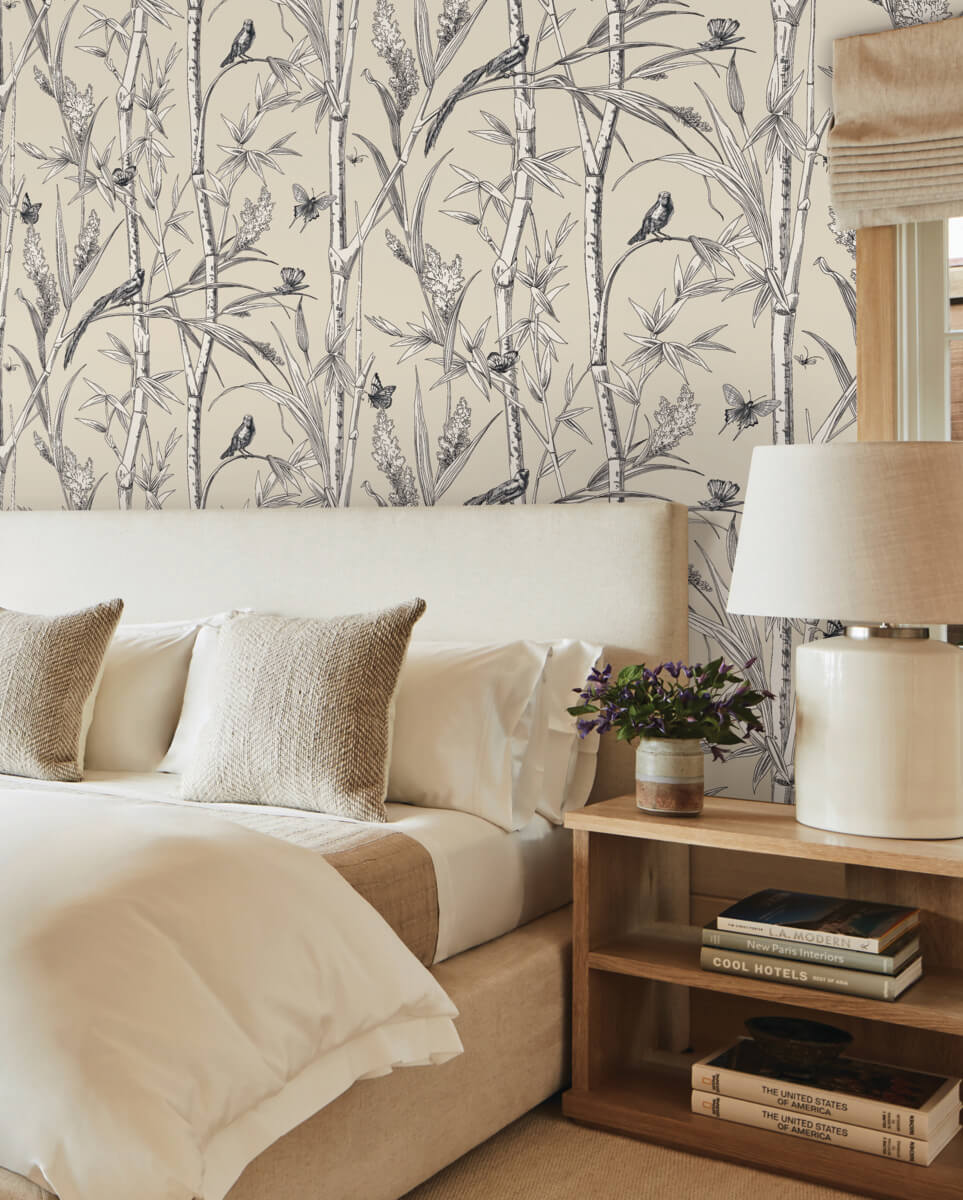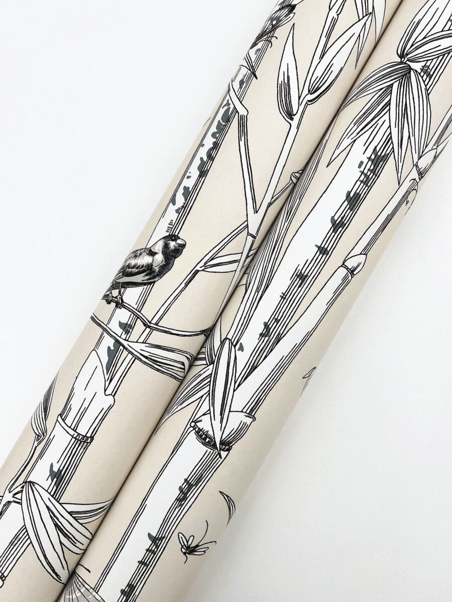 Bambou Toile perfectly captures the serenity of a bamboo forest, the illustrated flora and teeming wildlife inked in black and cream against sandy taupe. This Bambou Toile Wallpaper measures approximately 27 inches wide by 27 feet long, measuring approximately 60.8 square feet per roll. The quintessential design for timeless romance, toile (pronounced ‘twall’) traces its origins to 18th century fabrics. This celebrated motif is explored with a range of classical reproductions and modern reimaginings.