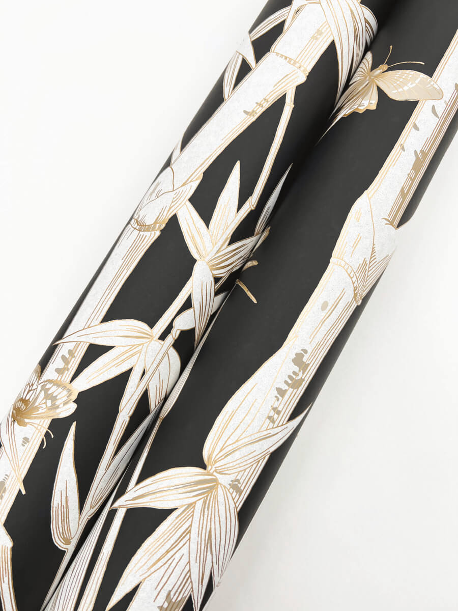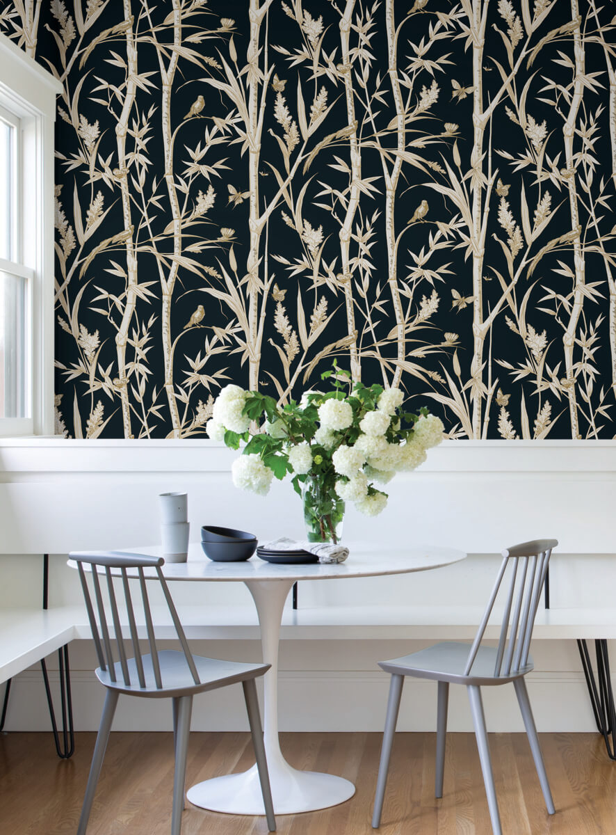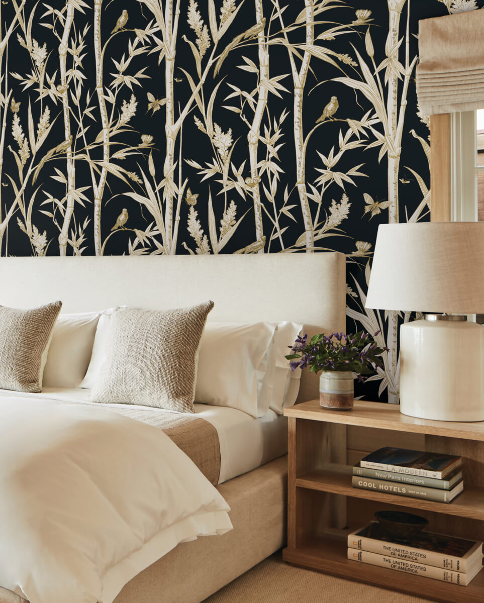 Bambou Toile perfectly captures the serenity of a bamboo forest, the illustrated flora and teeming wildlife inked in metallic gold and cool white against inky black. This Bambou Toile Wallpaper measures approximately 27 inches wide by 27 feet long, measuring approximately 60.8 square feet per roll. The quintessential design for timeless romance, toile (pronounced ‘twall’) traces its origins to 18th century fabrics. This celebrated motif is explored with a range of classical reproductions and modern reimaginings.