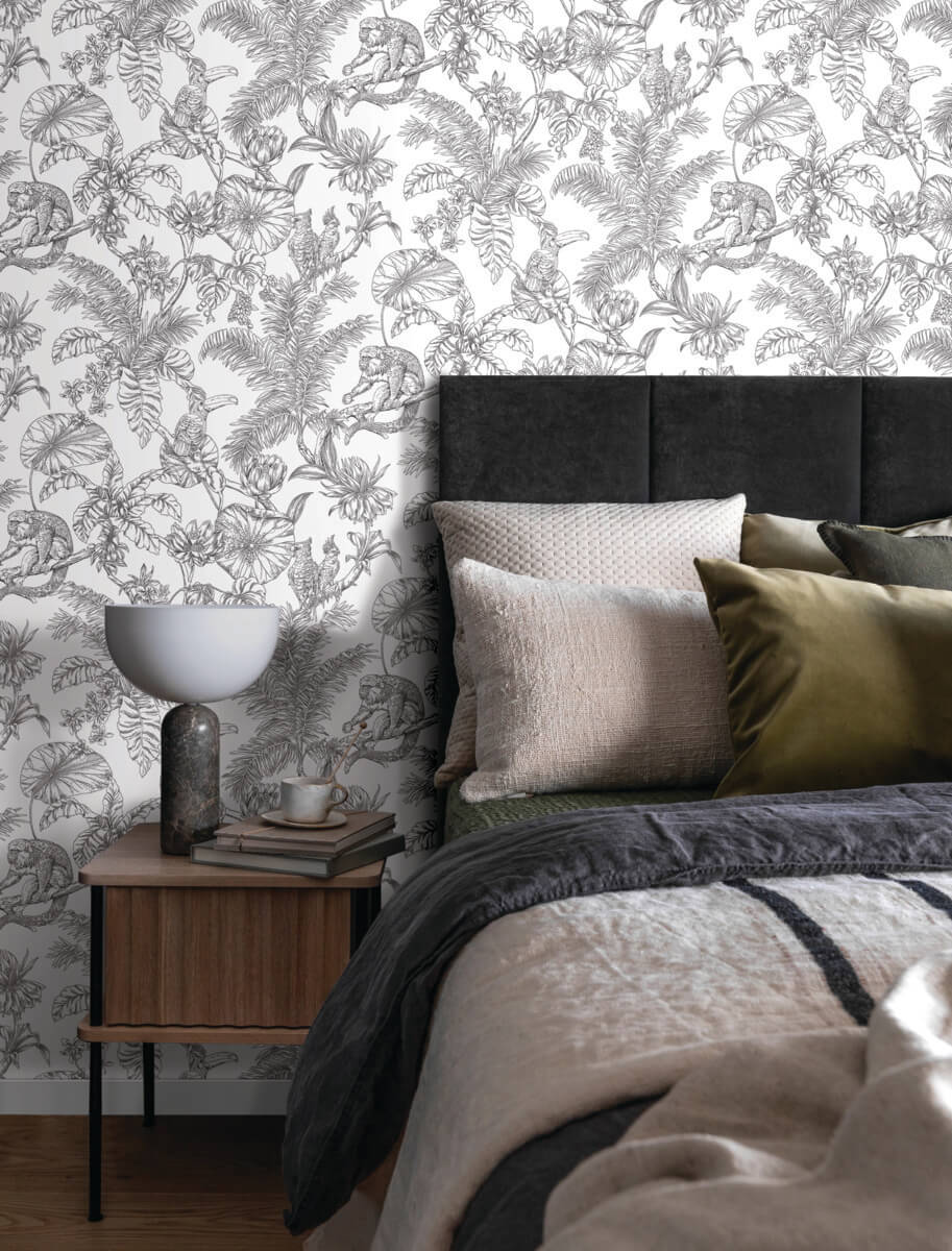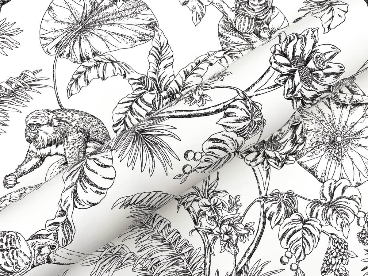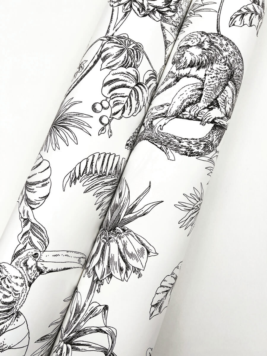 The simple and airy stylings of Tropical Sketch Toile are inked in thin lines of black against white. This Tropical Sketch Toile Wallpaper measures approximately 27 inches wide by 27 feet long, measuring approximately 60.8 square feet per roll. The quintessential design for timeless romance, toile (pronounced ‘twall’) traces its origins to 18th century fabrics. This celebrated motif is explored with a range of classical reproductions and modern reimaginings.