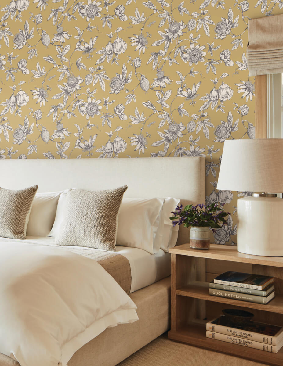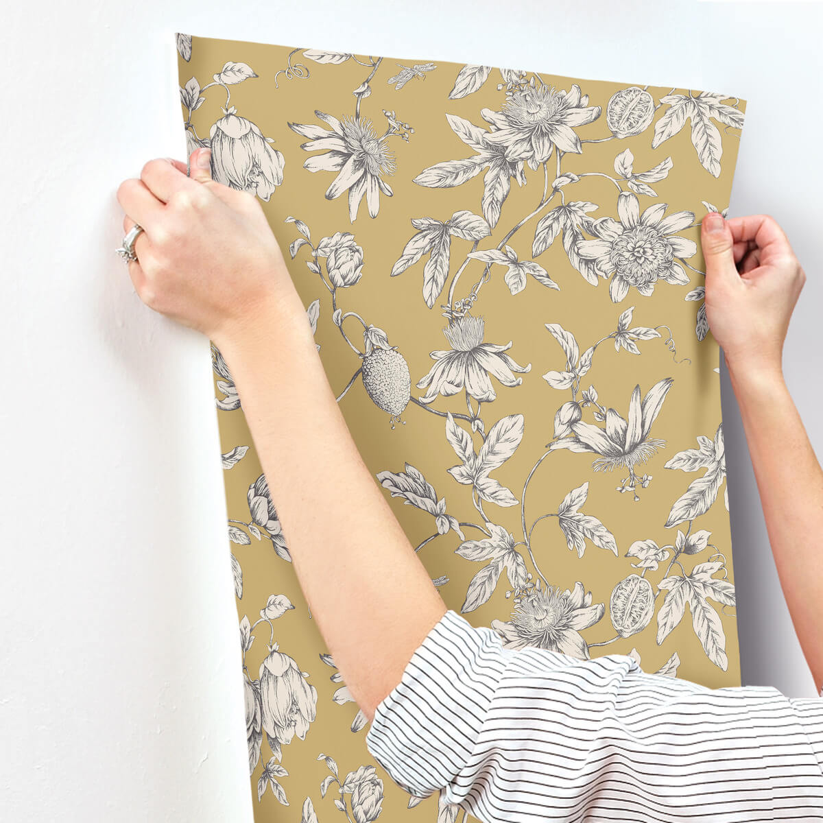 Meandering vines supporting impressive tropical blooms are illustrated in charcoal and cream against a golden amber backdrop. This Passion Flower Toile Wallpaper measures approximately 27 inches wide by 27 feet long, measuring approximately 60.8 square feet per roll. The quintessential design for timeless romance, toile (pronounced ‘twall’) traces its origins to 18th century fabrics. This celebrated motif is explored with a range of classical reproductions and modern reimaginings.