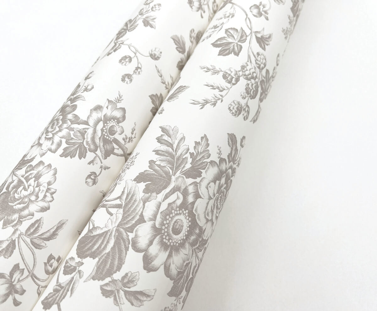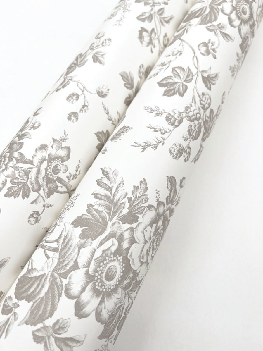Incredibly artistic detailing in silver-grey ink makes Anemone Toile a perfect example of timeless floral trail elegance. This Anemone Toile Wallpaper measures approximately 20.5 inches wide by 33 feet long, measuring approximately 56.4 square feet per roll. The quintessential design for timeless romance, toile (pronounced ‘twall’) traces its origins to 18th century fabrics. This celebrated motif is explored with a range of classical reproductions and modern reimaginings.