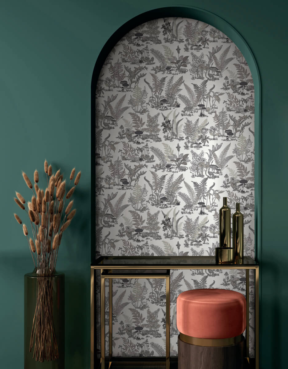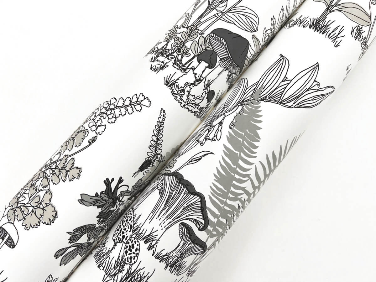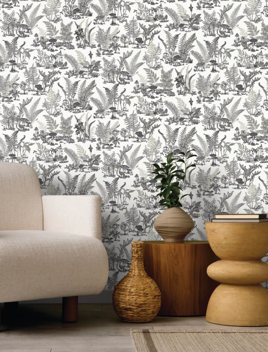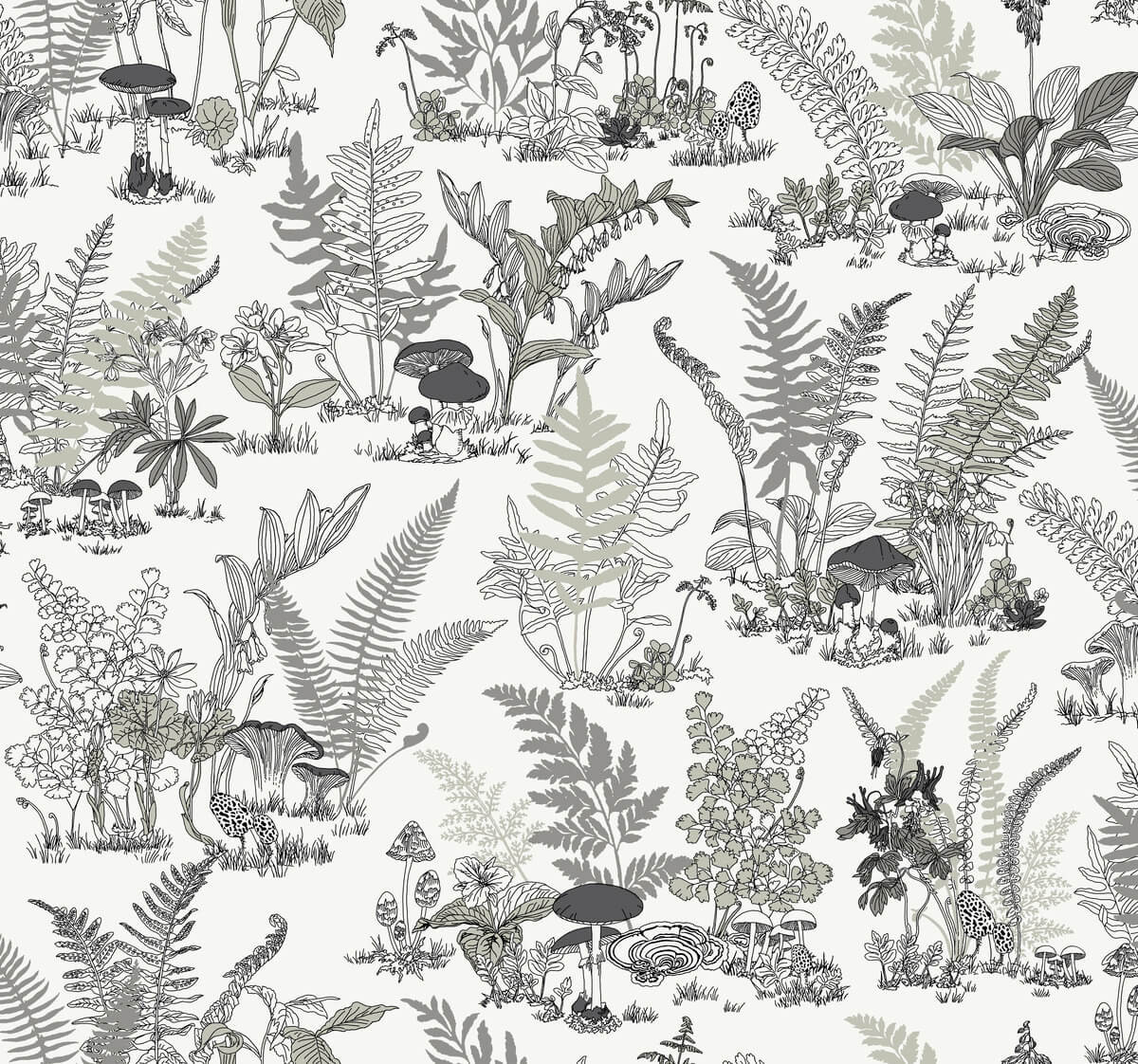 Mushroom Garden Toile's modern reimagination of the iconic style features artistic groupings of ferns, fungi, and wildflowers inked in shades of grey. This Mushroom Garden Toile Wallpaper measures approximately 27 inches wide by 27 feet long, measuring approximately 60.8 square feet per roll. The quintessential design for timeless romance, toile (pronounced ‘twall’) traces its origins to 18th century fabrics. This celebrated motif is explored with a range of classical reproductions and modern reimaginings.