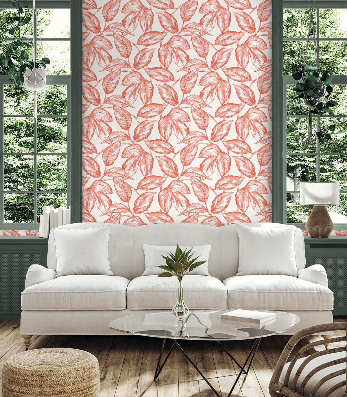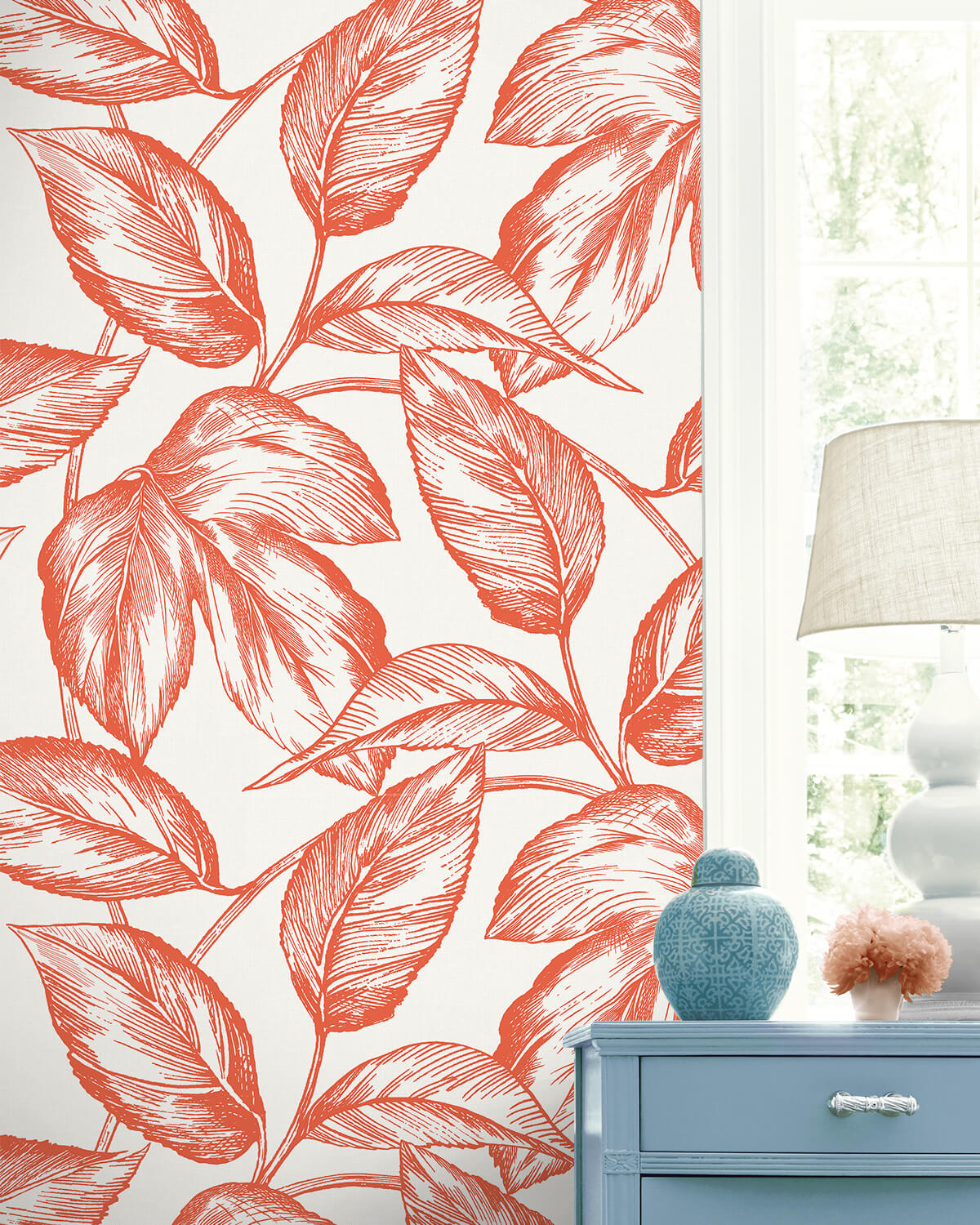 Seabrook Summer House Beckett Sketched Leaves Wallpaper - Rich Coral