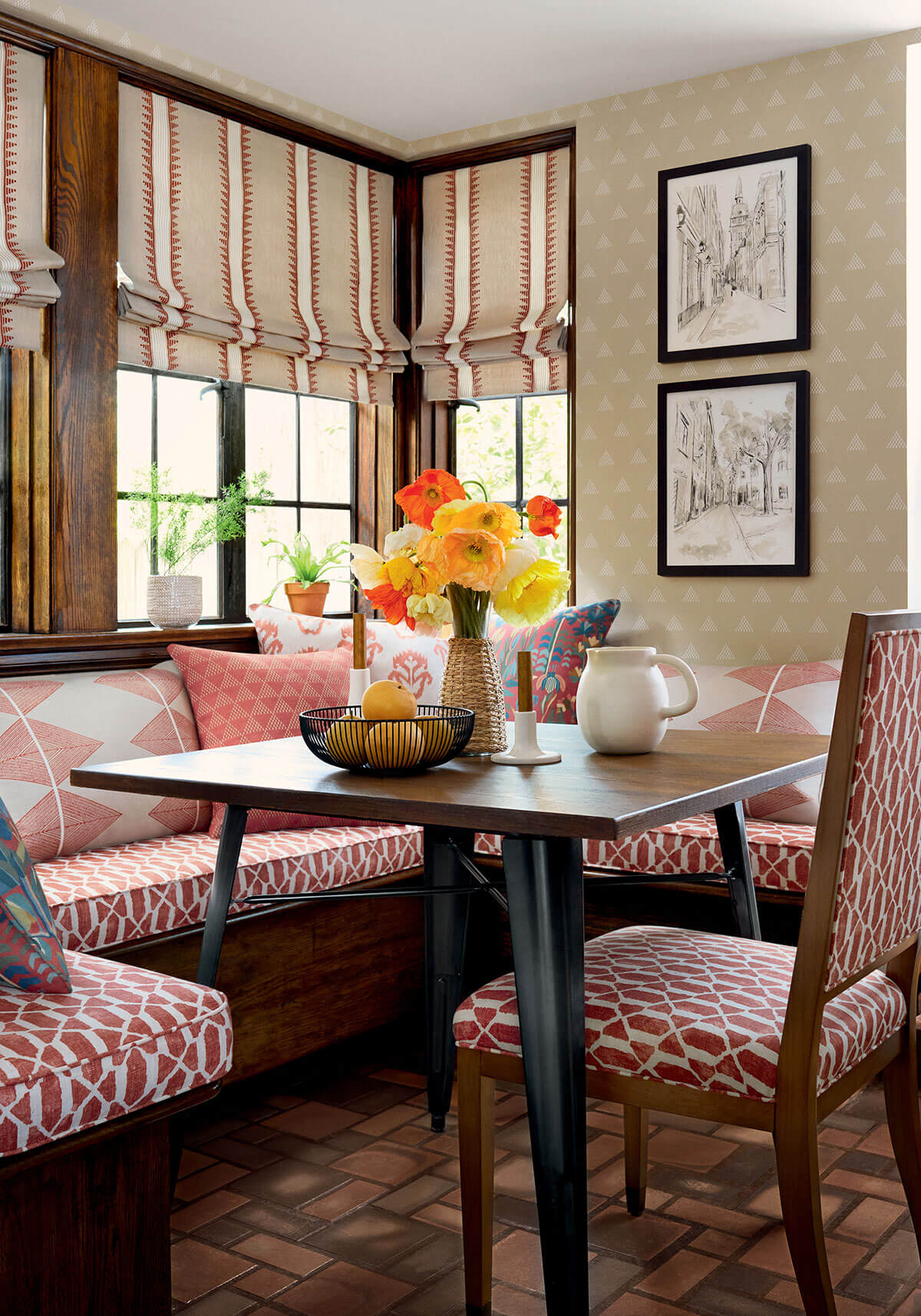 Evocative of the ridge line of mountain peaks, Ridge and Ridge Weave are wonderful small-scale prints to pair with other styles in the Vista collection. The woven fabric adds texture to the structured geometric design, while the wallcovering offers more open space for a saturated background. Thibaut Vista is a warm and inviting collection of contemporary wallpaper inspired by nature's beauty. From geometrics reminiscent of mountainous peaks to graphic botanicals of flowering cacti, Vista evokes the excitement of the great outdoors in a modern way. The collection presents an earthy color palette.